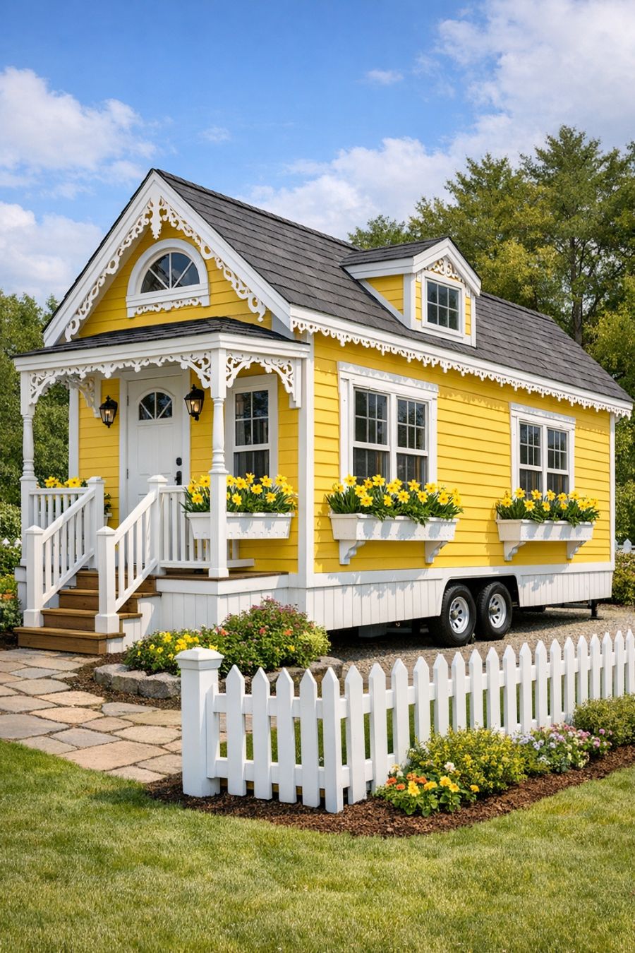The exterior of this park model RV is nothing short of delightful. Painted in a bright, cheerful yellow, it exudes a sunny, beachy vibe that immediately lifts the spirits of anyone who catches a glimpse. The clapboard siding is complemented by delicate white gingerbread trim, adding a touch of whimsy and charm. Window boxes brimming with blooming daffodils line the facade, injecting bursts of color that enhance its playful appearance. A classic white picket fence completes the picturesque scene, making it a standout sight in any setting.