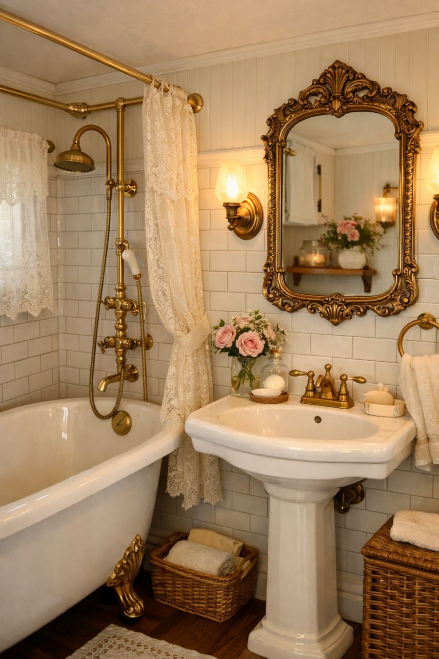 The bathroom offers a blend of functionality and vintage charm, with a clawfoot tub serving as the centerpiece. Subway tiles in a classic white provide a clean backdrop, while gold fixtures add a touch of opulence. A pedestal sink with an ornate mirror above it reflects the room's soft lighting, enhancing the sense of space. Floral accents and a delicate lace curtain complete the look, creating a tranquil retreat for daily rituals.