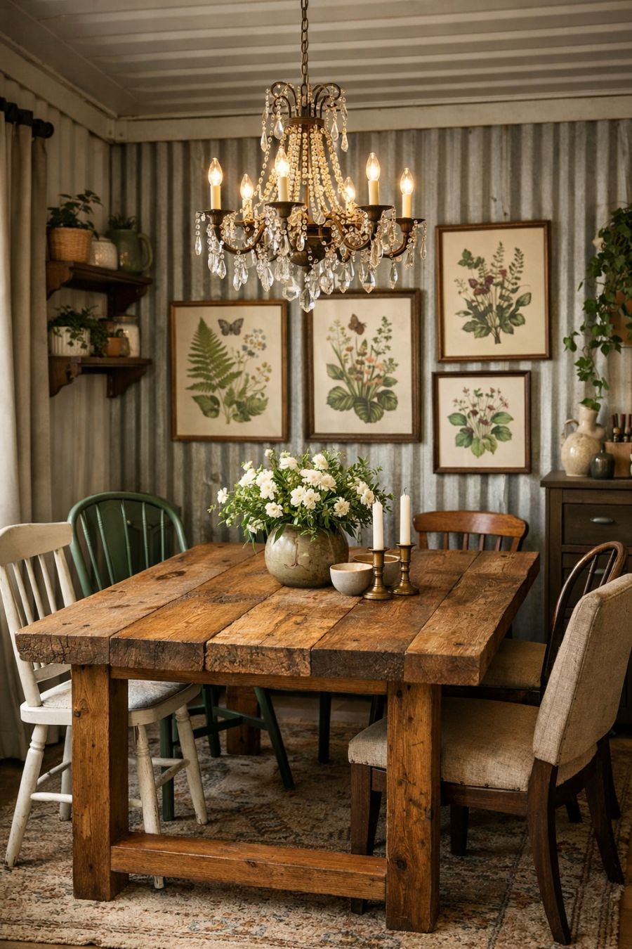 The dining area is an elegant space that seamlessly combines functionality with aesthetic appeal. A reclaimed wood dining table stands as the centerpiece, surrounded by mismatched chairs that add a touch of eclectic charm. Above, a delicate chandelier casts a soft glow, creating an intimate ambiance perfect for family meals or entertaining guests. The walls are adorned with botanical prints, bringing a hint of nature indoors. This area is thoughtfully designed to encourage connection and conversation, making every meal a special occasion.