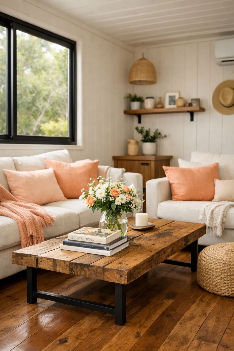 Inside, the living area is a harmonious blend of comfort and style. The walls are painted in a soothing off-white, accentuated by soft peach-colored cushions and throws that reflect the home's exterior. Natural light pours in through large windows, highlighting the cozy seating arrangement and the polished wooden floors. A rustic coffee table sits centrally, adorned with fresh flowers and art books, enhancing the room's inviting atmosphere. The overall design is minimalist yet warm, with personal touches that make it feel like a true sanctuary.