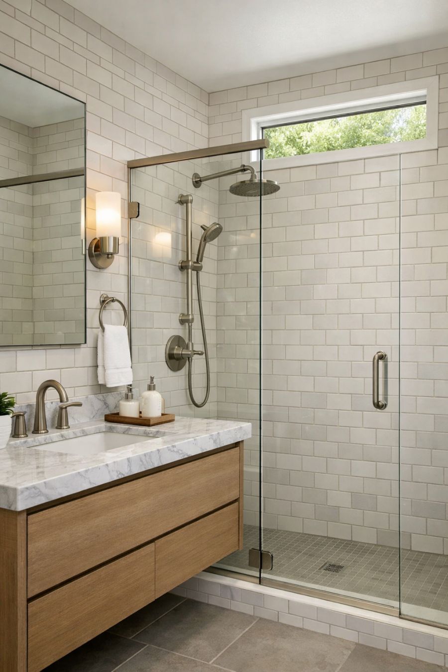 The bathroom is a sanctuary of modern design and functionality. It features a spacious walk-in shower with sleek glass doors, providing an open and airy feel. The walls are lined with elegant subway tiles in soft neutral tones, creating a timeless look. A floating vanity with a marble countertop offers a touch of luxury, complemented by brushed nickel fixtures. Natural light floods the space through a high window, enhancing the clean and refreshing atmosphere. The overall design prioritizes comfort and ease, making it a perfect place to unwind.