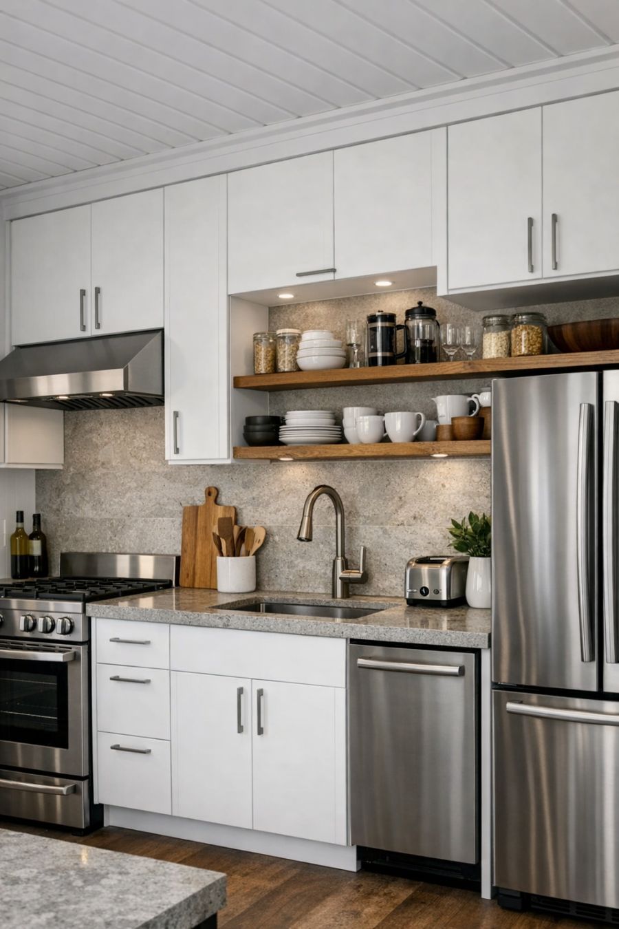 The kitchen is a modern haven, with sleek white cabinetry providing ample storage and a sense of cleanliness. The countertops are crafted from durable stone, offering both beauty and practicality for meal preparation. Stainless steel appliances add a contemporary touch, blending seamlessly with the overall design. Open shelving displays a curated collection of crockery and glassware, adding personal flair to the space. The kitchen's layout is efficient and user-friendly, making it a joy for both novice cooks and culinary enthusiasts.