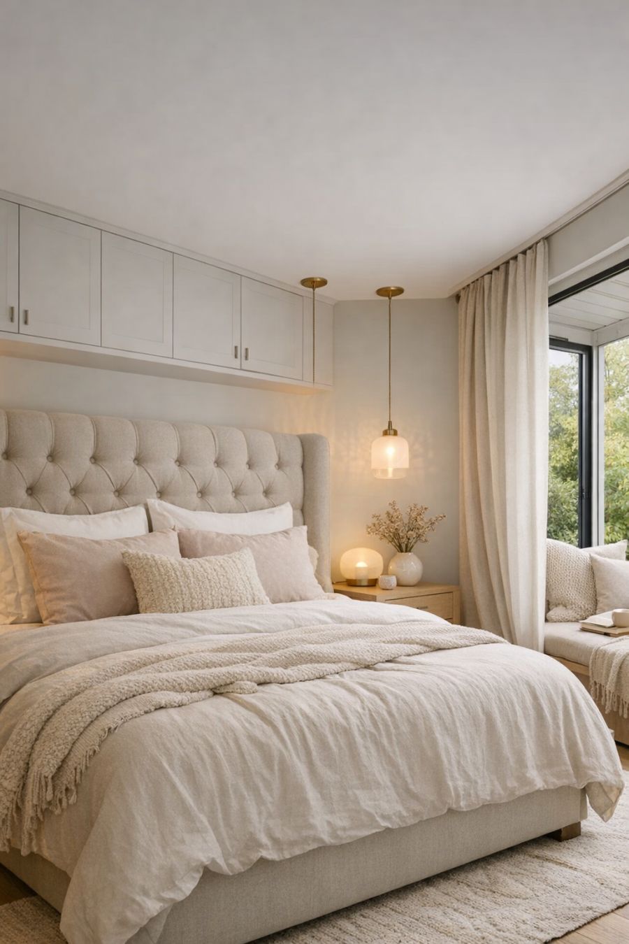 The bedroom is a peaceful retreat, characterized by its soft color palette and plush textures. A large bed serves as the focal point, draped in luxurious linens and accentuated by a tufted headboard. The room is kept uncluttered, with built-in wardrobes offering discreet storage solutions. Subtle lighting fixtures create a calming ambiance, perfect for relaxation and rest. A small reading nook by the window invites quiet moments of reflection, surrounded by the gentle sounds of nature from the garden outside.