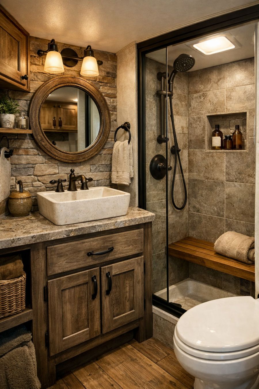 The bathroom area combines rustic charm with modern amenities, creating a space that's as functional as it is stylish. The use of natural materials, like stone and wood, gives the room an organic feel, while a neutral color palette ensures a soothing atmosphere. A compact yet elegant sink and vanity provide ample storage, while a well-designed shower area maximizes space without compromising on comfort. Thoughtful details, like vintage-style fixtures and soft, ambient lighting, complete the bathroom's tranquil and inviting vibe.