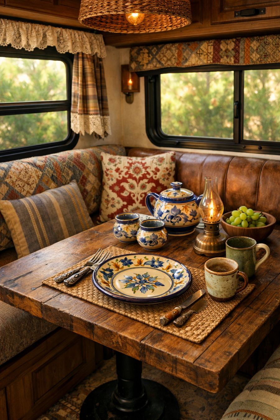 The dining area is a charming nook that combines functionality with style. A rustic wooden table, accompanied by cushioned seating, provides a perfect spot for meals and gatherings. The space is adorned with quaint details like antique cutlery and hand-painted ceramics, reflecting a love for artisanal craftsmanship. Large windows allow natural light to flood the area, highlighting the intricate patterns on the textiles and casting a warm glow over the entire dining experience.