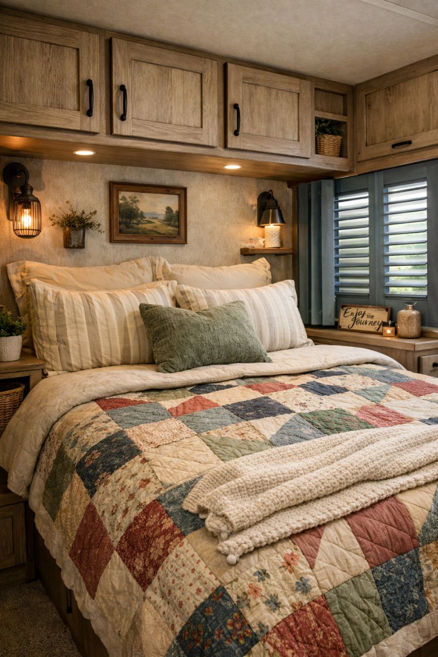 In the bedroom, tranquility reigns supreme. The space is dominated by a comfortable bed adorned with soft linens and a patchwork quilt that adds a touch of nostalgia. Natural light filters through the slate blue shutters, creating a serene atmosphere perfect for rest and relaxation. Clever storage solutions are integrated into the design, ensuring a clutter-free environment, while subtle lighting and rustic decor enhance the cozy, inviting feel of this personal sanctuary.