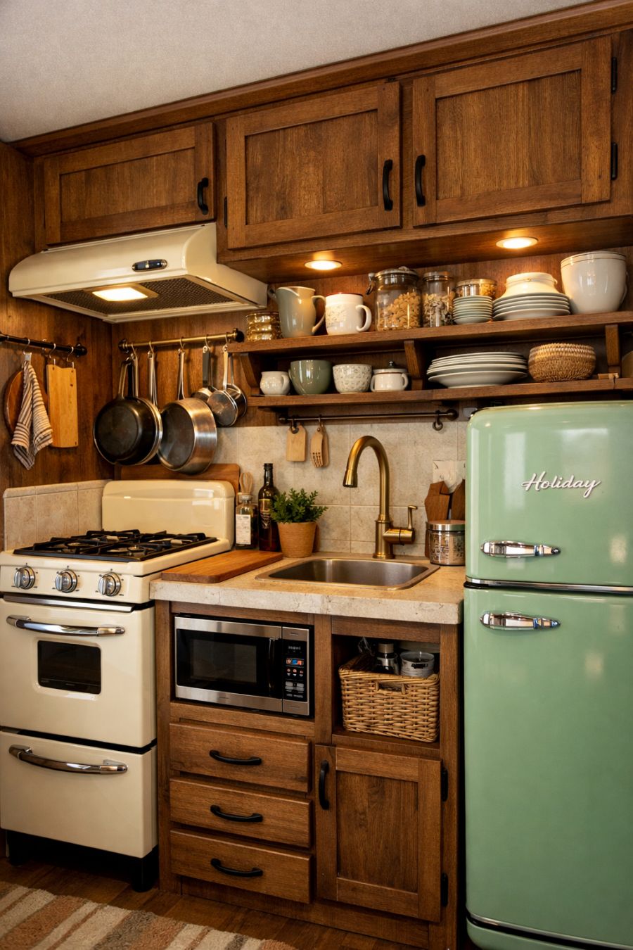 The kitchen area is a compact yet efficient space designed with the modern cook in mind. It features sleek, vintage-style appliances that blend seamlessly with the rustic wooden cabinetry. Open shelving displays charming crockery and glassware, adding a personal touch to the functional design. The use of warm earthy colors complements the overall theme, while clever storage solutions ensure that every inch of space is utilized effectively, making cooking a pleasure rather than a chore.