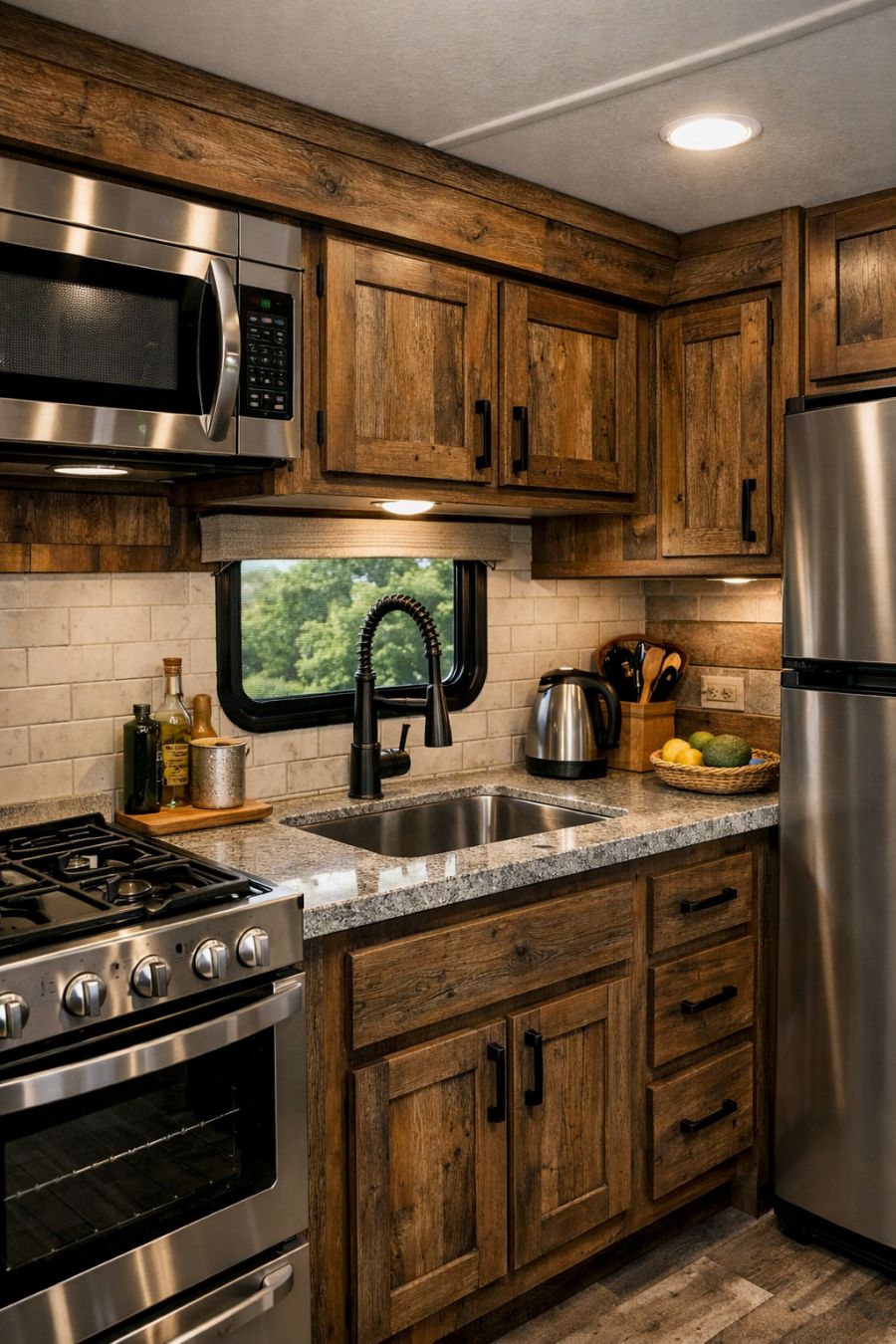 The kitchen is a testament to efficient design, offering all the essentials in a compact, stylish space. The cabinetry is crafted from reclaimed wood, its natural grain adding texture and warmth to the room. Stainless steel appliances provide a modern contrast, ensuring functionality without compromising on style. The countertops are made of polished stone, offering a durable surface for meal preparation. A small window above the sink allows for natural light and offers a view of the outside, making everyday tasks feel connected to the beauty of nature. This kitchen is both practical and inviting, encouraging culinary creativity.