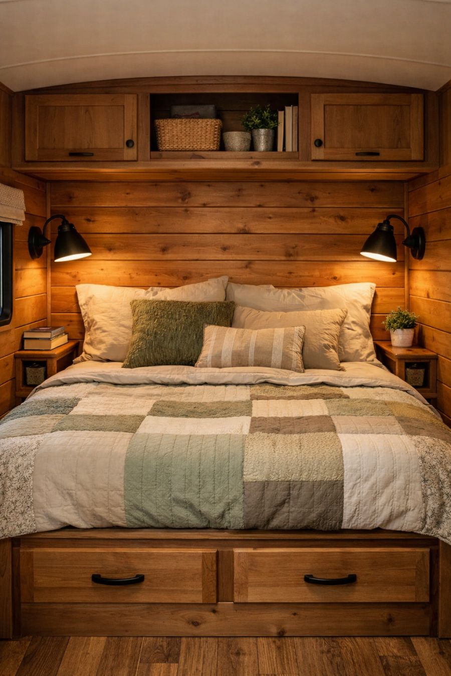 The bedroom area in this camper is a cozy nook designed for restful nights. A plush, full-sized bed is nestled against the far wall, adorned with soft linens and a quilt in muted, natural colors. The walls are lined with cedar wood, enhancing the feeling of being enveloped in warmth and comfort. Small reading lamps are mounted on either side of the bed, providing soft lighting for nighttime reading. Built-in storage solutions, such as drawers underneath the bed and shelves above, ensure that everything has its place, maintaining a sense of order and tranquility in this intimate space.