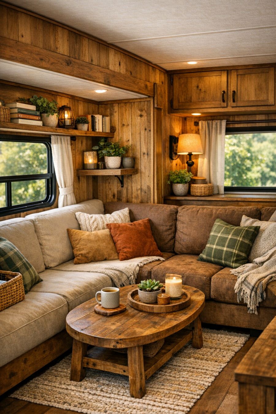 The living area within this cozy camper is a delightful fusion of rustic charm and modern comfort. Soft, plush seating is arranged to make the most of the compact space, with cushions in earthy tones that complement the warm wood paneling on the walls. Large windows allow natural light to flood the room, creating a bright and airy atmosphere that is both inviting and relaxing. The decor includes hand-crafted wooden shelves adorned with small potted plants and books, adding a personal touch to the space. This area exudes warmth and coziness, making it the perfect spot to unwind after a day of adventure.