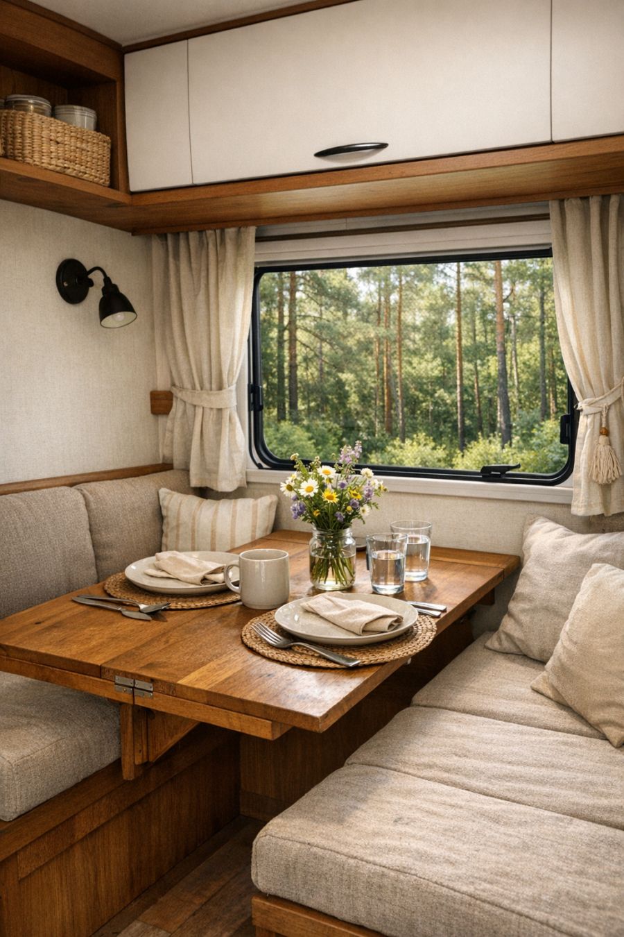 The dining area is a quaint yet functional space, thoughtfully designed to maximize every inch of the camper. A foldable wooden table is situated by a window, offering picturesque views of the surrounding forest while you enjoy your meals. The seating consists of built-in benches with soft cushions, providing comfort and a sense of intimacy. The table is adorned with simple yet elegant tableware and a small vase of fresh wildflowers, echoing the natural theme of the camper. This area serves as a charming spot for both dining and socializing, with its warm ambiance encouraging long conversations over meals.