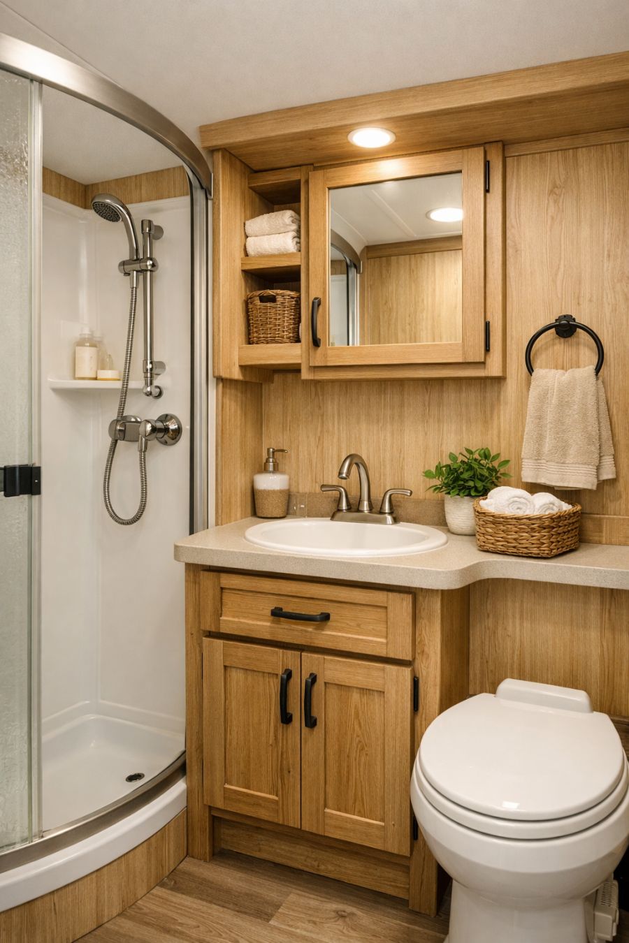 The bathroom in this cottage RV camper is a marvel of compact design, offering all the essentials within a serene setting. The walls are clad in light-colored wood, creating a clean and calming atmosphere. A small, efficient shower is tucked into one corner, featuring sleek fixtures and a detachable showerhead for convenience. The sink is set into a wooden vanity with ample storage below, while a mirror above reflects light and enhances the sense of space. The color scheme incorporates soft earth tones, which complement the natural materials and create a harmonious, soothing environment.