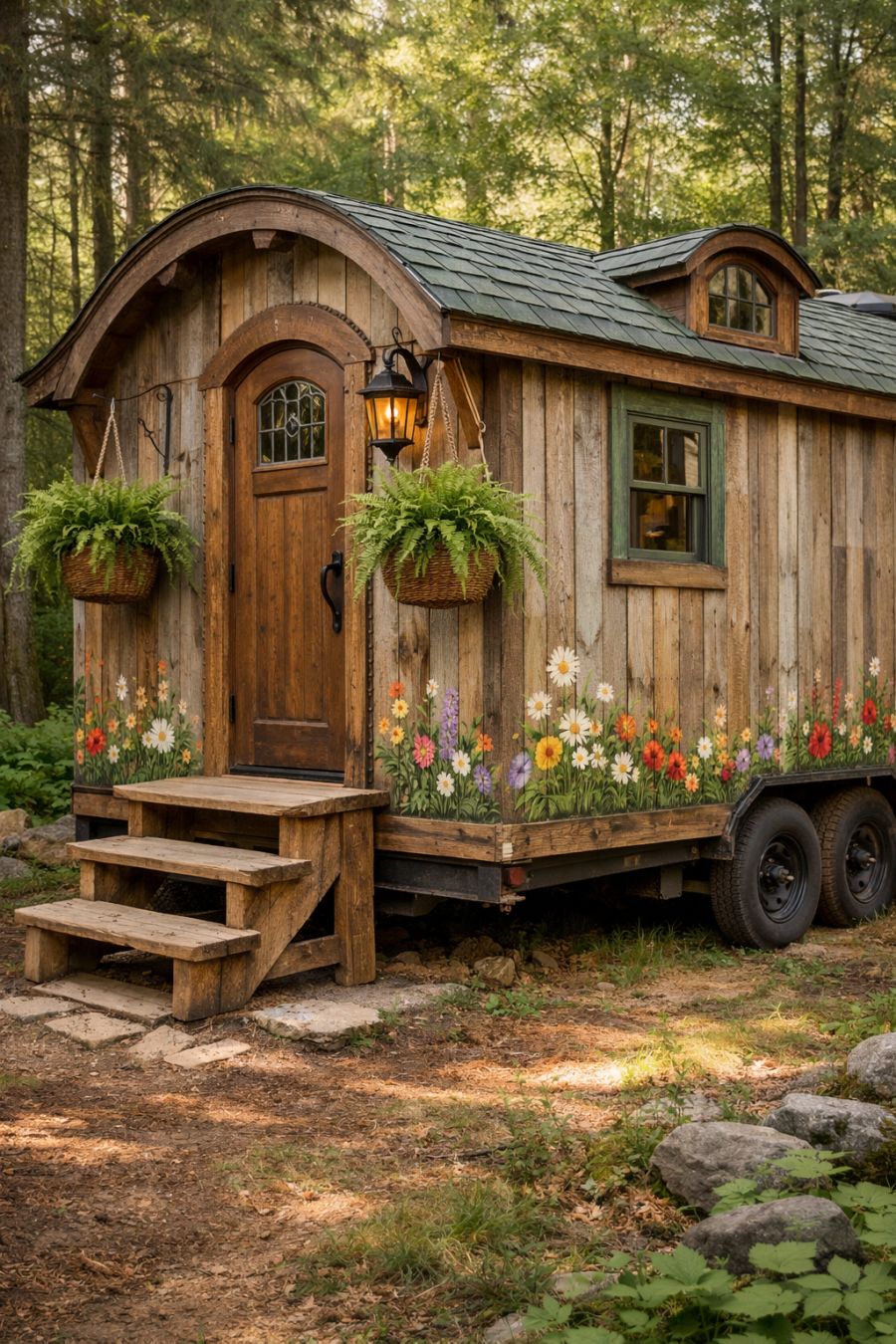 The exterior of this charming cottage RV camper is a stunning blend of natural materials and artistic flair. The weathered cedar wood gives the structure a rustic, timeworn appearance that feels perfectly at home in a forest clearing. Along the bottom edge, intricate murals of wildflowers are hand-painted, adding a splash of color and whimsy to the facade. Rustic wooden steps lead up to the door, flanked by hanging baskets overflowing with vibrant green ferns. This picturesque setup makes the camper feel like a natural extension of its woodland surroundings, inviting you to step inside and explore further.