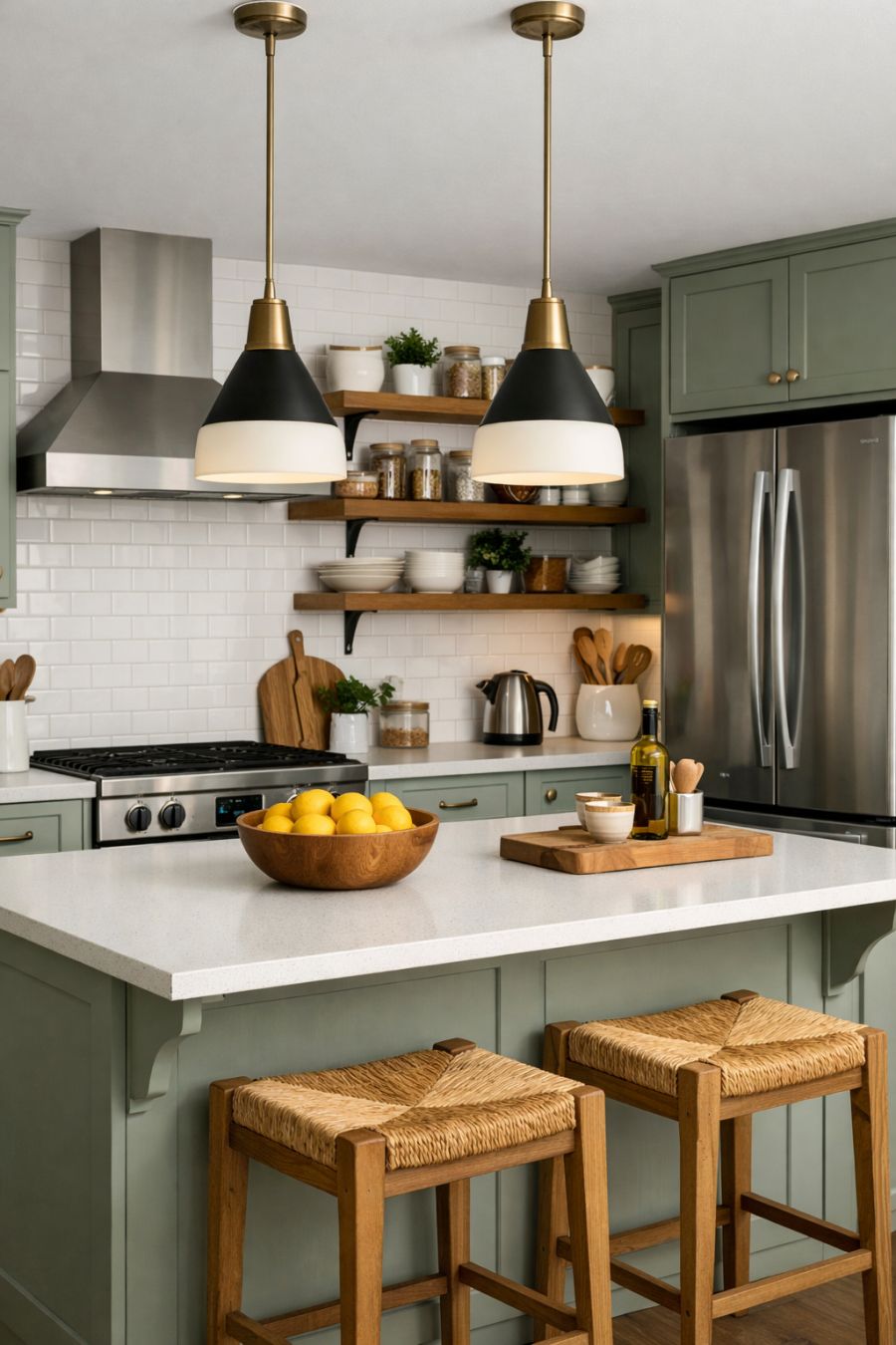 The kitchen is a harmonious mix of functionality and aesthetic appeal, featuring sleek countertops and state-of-the-art appliances that cater to both novice cooks and culinary enthusiasts. Custom cabinetry in a soft, muted hue adds a touch of elegance, while open shelving provides a practical yet stylish storage solution. A central island serves as a versatile workspace and casual dining spot, highlighted by pendant lights that add a contemporary flair. The overall design emphasizes efficiency without compromising on style.