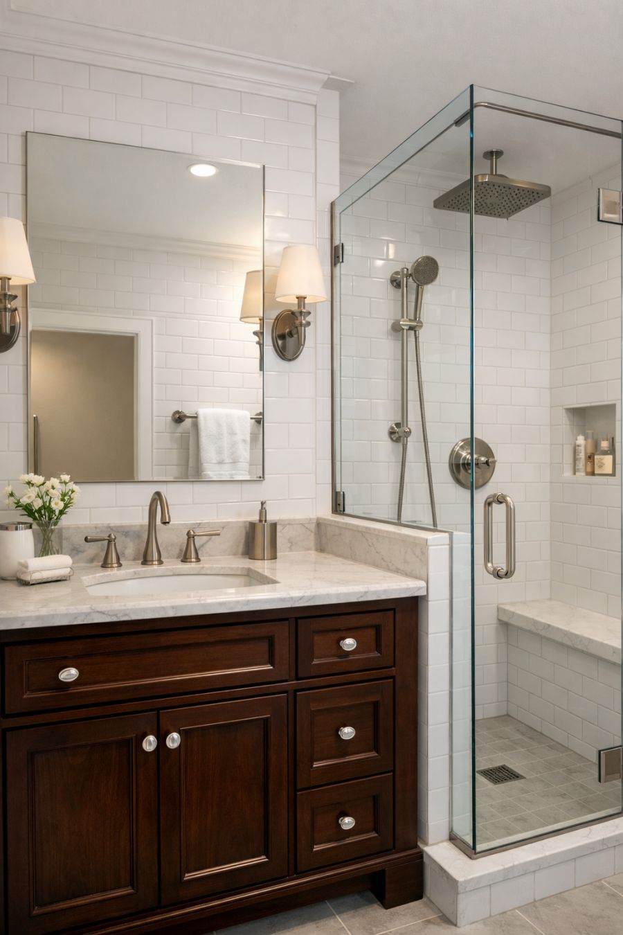 The bathroom is a perfect blend of classic elegance and contemporary convenience, featuring high-quality materials and a thoughtful layout. Crisp white tiles line the walls, contrasting beautifully with the rich, dark wood of the vanity. A large mirror above the sink enhances the sense of space, while modern fixtures in a sleek metallic finish add a touch of sophistication. The spacious shower area, enclosed by clear glass panels, provides a refreshing escape with its rain showerhead and clean lines.