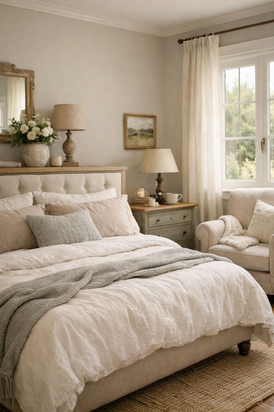 The bedroom area offers a serene retreat, with a design that prioritizes comfort and tranquility. Soft, muted colors adorn the walls, creating a calming backdrop for rest and relaxation. A plush, king-sized bed with luxurious linens invites restful sleep, while carefully selected furnishings, such as a vintage dresser and cozy armchair, add character to the space. Large windows allow natural light to pour in, highlighting the room's simple yet elegant decor and fostering a peaceful ambiance.