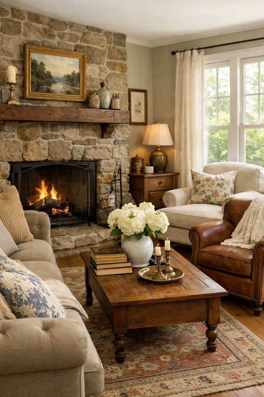 Upon entering, the living area surprises with its spaciousness and airy atmosphere, accentuated by large windows that invite an abundance of natural light. The interior design features an elegant mix of vintage and contemporary furnishings, creating a cozy yet refined ambiance. Soft, neutral tones on the walls complement the polished wooden floors, while a classic stone fireplace acts as the room's focal point. Subtle decorative elements, such as plush textiles and tasteful artwork, add layers of comfort and style.