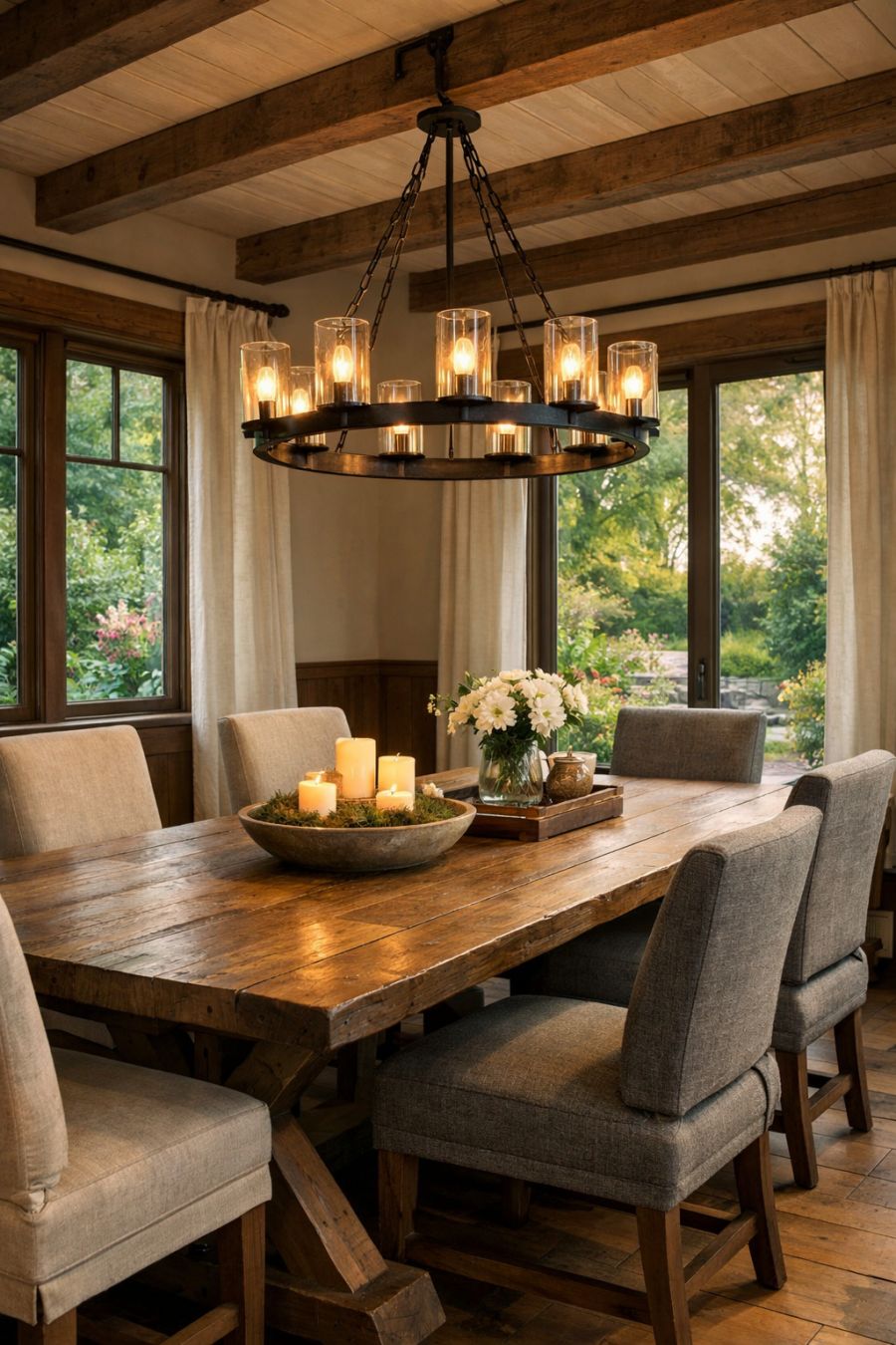 The dining area reflects a seamless blend of rustic charm and modern elegance, with a large, handcrafted wooden table at its center. Surrounded by comfortable upholstered chairs, the space is perfect for intimate family meals or entertaining guests. The room is illuminated by a stylish pendant light fixture that casts a warm glow, enhancing the inviting atmosphere. Large windows frame picturesque views of the garden, integrating the beauty of the outdoors into the dining experience.