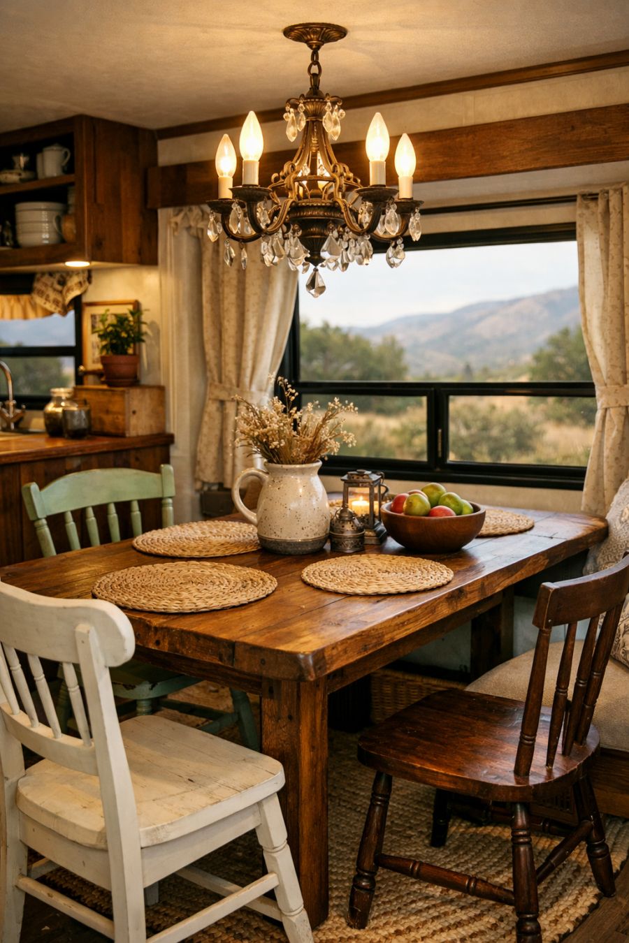 The dining area is seamlessly integrated into the open-plan layout, offering a delightful space for meals. A handcrafted wooden table, surrounded by mismatched chairs, adds a touch of whimsy and charm. The table is positioned near a window, offering diners a delightful view of the surrounding landscape. Overhead, an antique chandelier casts a soft, ambient light, enhancing the cozy atmosphere. Thoughtful details, like a woven rug and decorative placemats, add layers of warmth and style.