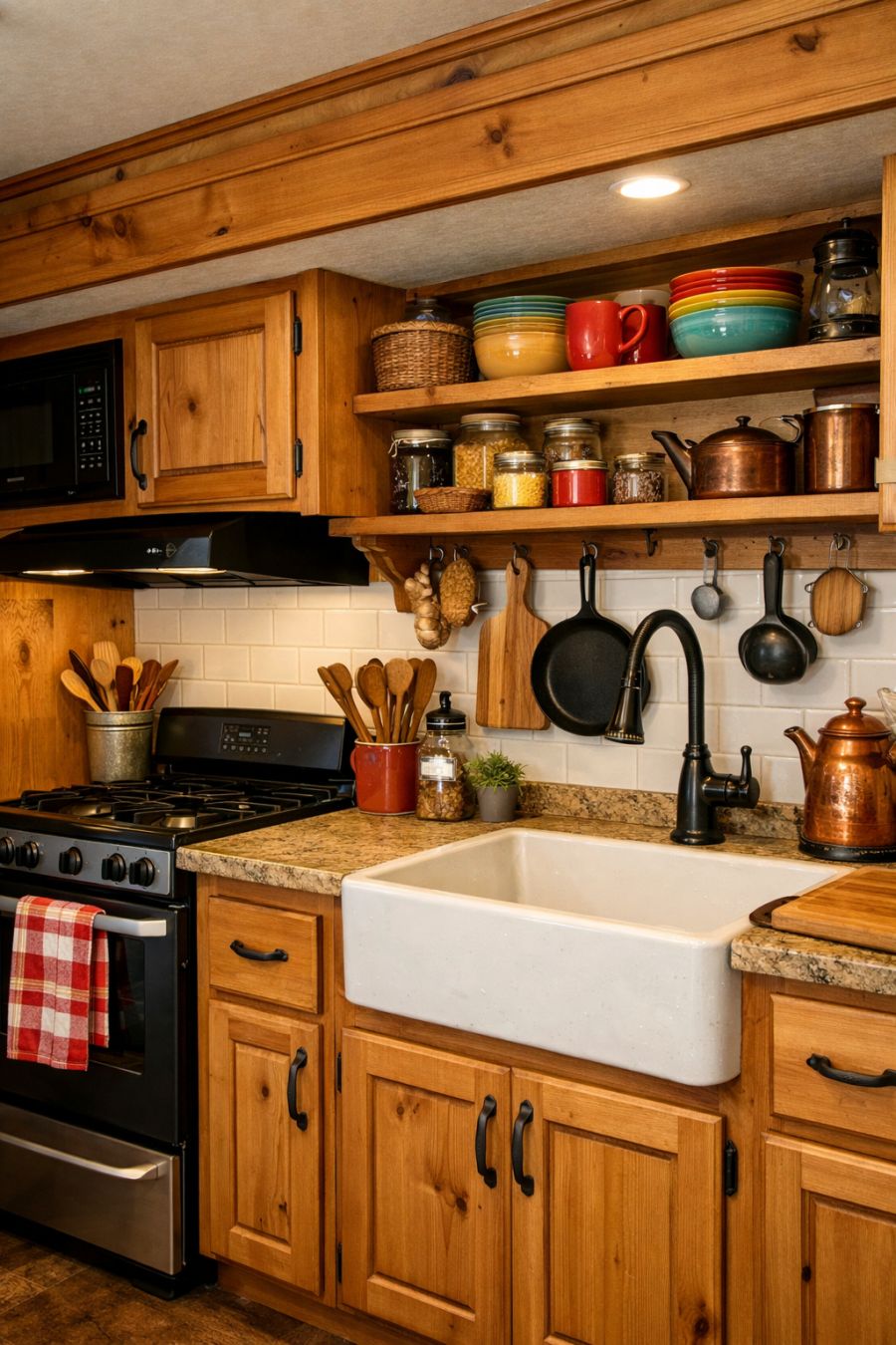 The kitchen area is a marvel of efficiency and style, with every inch thoughtfully utilized. Pine cabinetry complements the rustic theme, providing ample storage space for essentials. A compact yet fully equipped range and oven make cooking a breeze, while a deep farmhouse sink adds a touch of vintage charm. The countertops, made of polished stone, offer a durable and attractive workspace. Open shelving displays an array of colorful dishware and rustic kitchen tools, adding personality and warmth to the space.