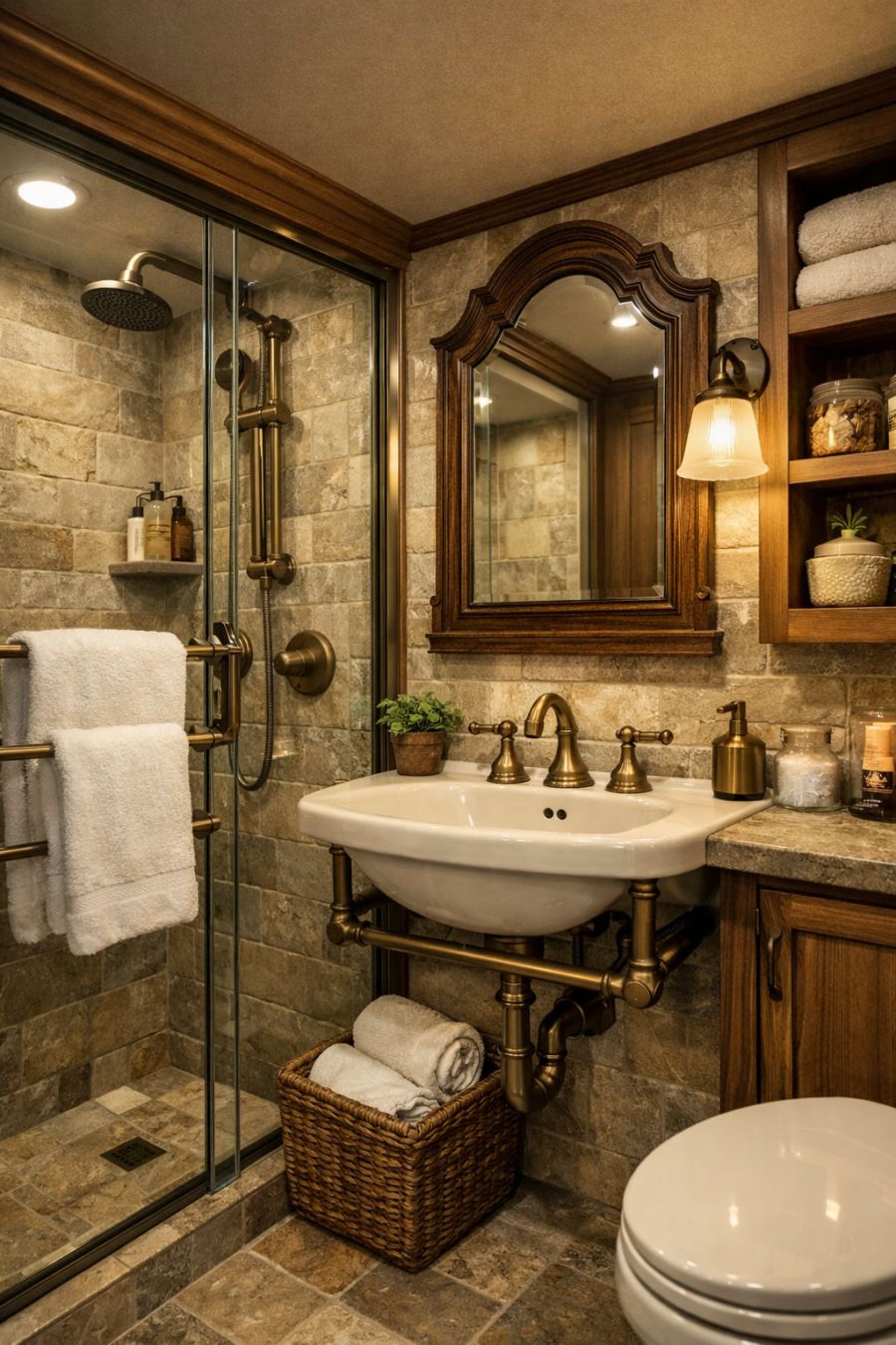 The bathroom is a study in compact elegance, with careful attention to detail. Natural stone tiles line the floor and walls, creating a spa-like atmosphere. A walk-in shower with a glass door offers a modern touch, while a vintage-style sink and mirror add character. The fixtures are in a brushed bronze finish, complementing the rustic aesthetic. Thoughtful touches, such as a heated towel rack and built-in shelving, enhance the functionality and comfort of the space.