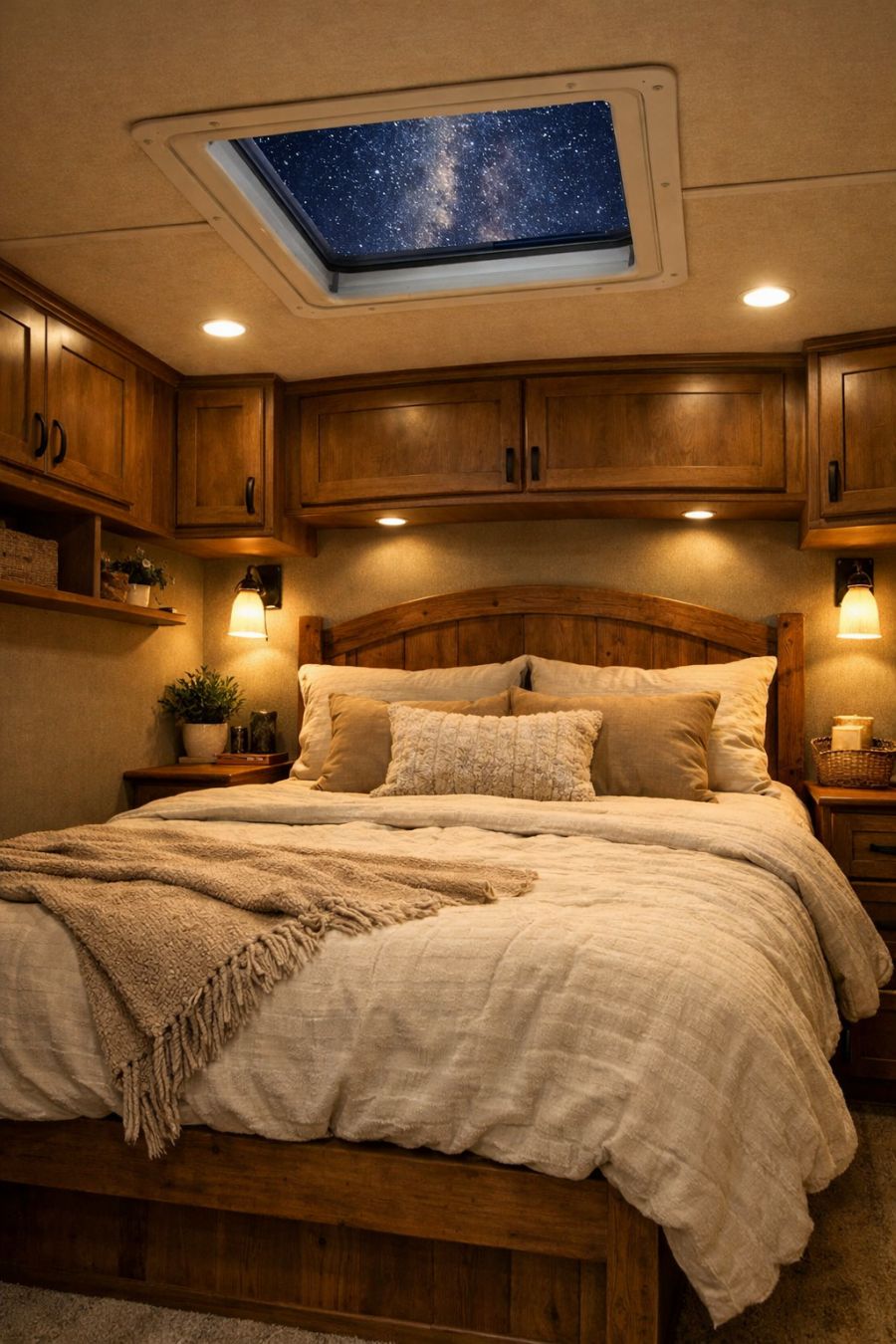 The bedroom area is a tranquil retreat, designed for rest and relaxation. A cozy, queen-sized bed with a handcrafted wooden frame is the focal point, dressed in soft, natural linens. Above the bed, a skylight offers a glimpse of the stars, adding a dreamy touch to the space. Built-in storage solutions line the walls, keeping belongings organized and the space uncluttered. The walls are painted in calming earth tones, creating a serene atmosphere that's perfect for unwinding after a long day.