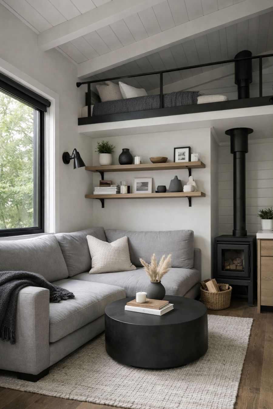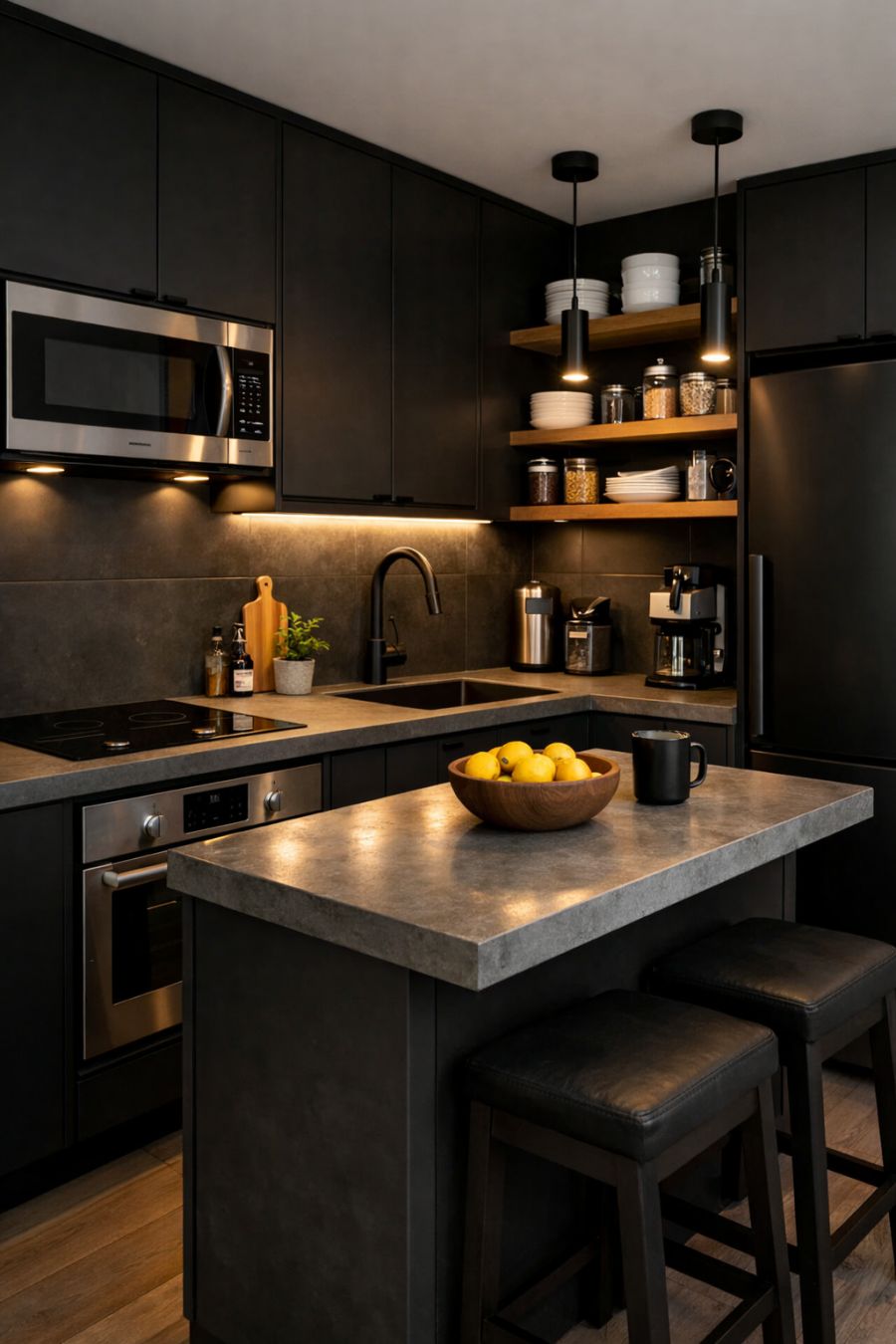 The kitchen area is a testament to the efficient use of space, featuring state-of-the-art appliances integrated seamlessly into custom cabinetry. Matte black finishes paired with polished concrete countertops create a sleek, modern look that is both functional and stylish. Open shelving provides easy access to everyday essentials, while a compact island doubles as extra prep space and a casual dining spot. Thoughtful lighting design, including under-cabinet LEDs, ensures that this small kitchen is both practical and inviting.