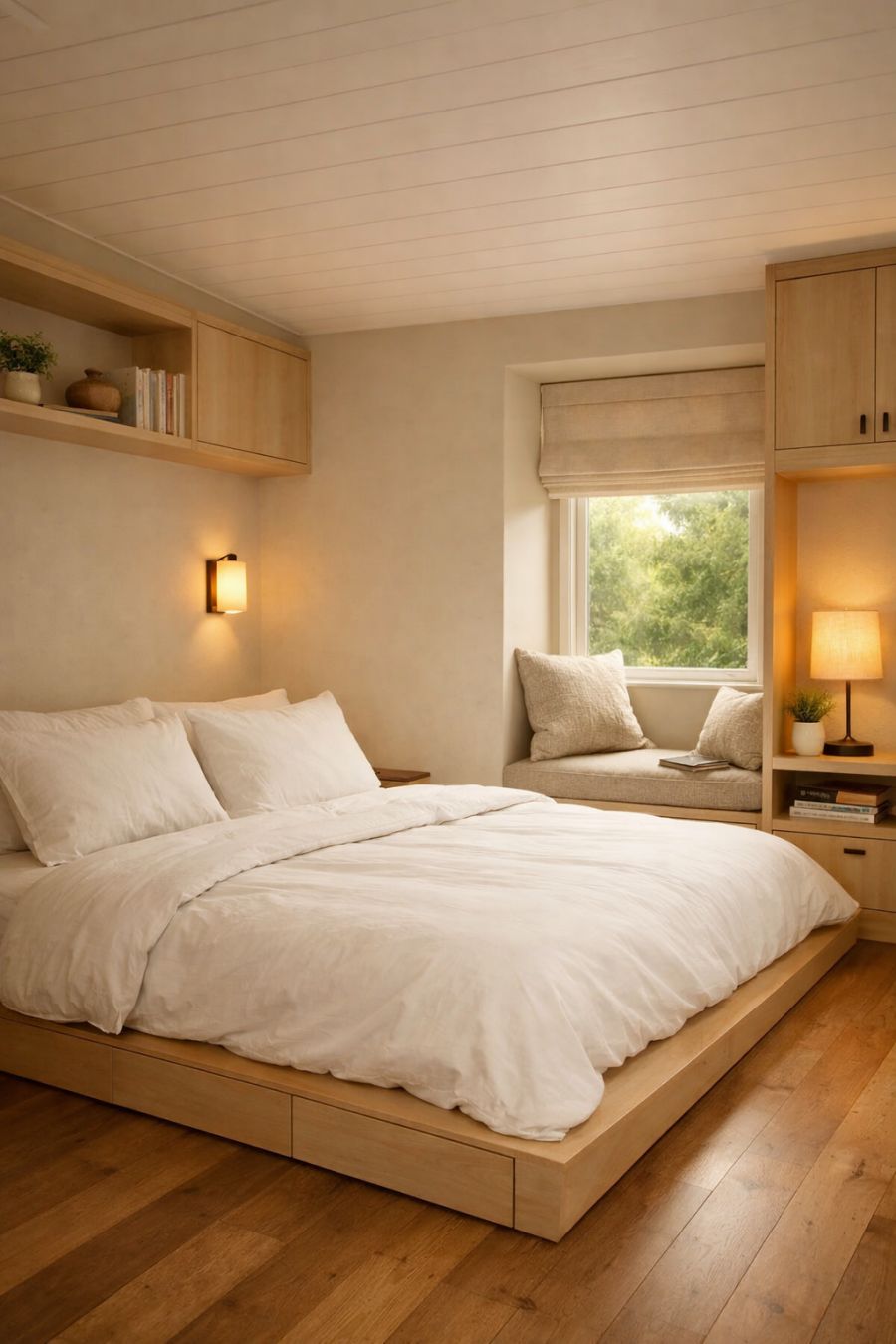 In the bedroom, simplicity meets serenity, with a design that prioritizes comfort and tranquility. A low-slung platform bed with crisp white linens serves as the focal point, surrounded by walls painted in soothing neutral tones. Built-in storage solutions ensure that the space remains clutter-free, while a small reading nook by the window offers a peaceful escape. Soft lighting and minimal decor complete the room, making it an ideal retreat for rest and relaxation.