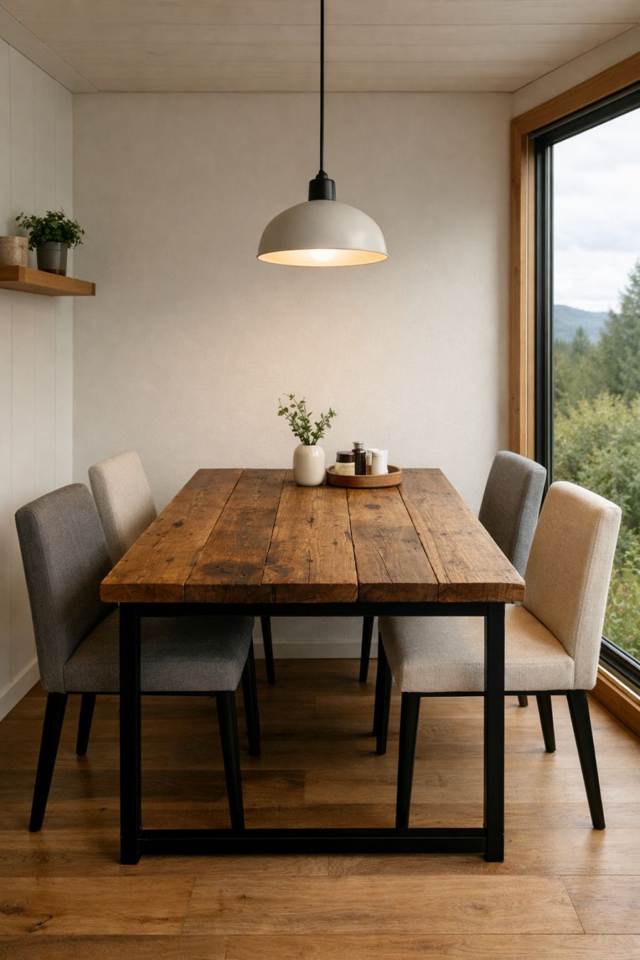 The dining area, though compact, is a masterpiece of minimalist design. A sleek, rectangular table made from reclaimed wood serves as the centerpiece, surrounded by four modern chairs with clean lines and subtle fabric upholstery. Above the table hangs an understated pendant light, providing focused illumination while maintaining the room's simple elegance. A large window beside the dining setup allows diners to enjoy views of the surrounding landscape, blurring the line between indoor and outdoor living.