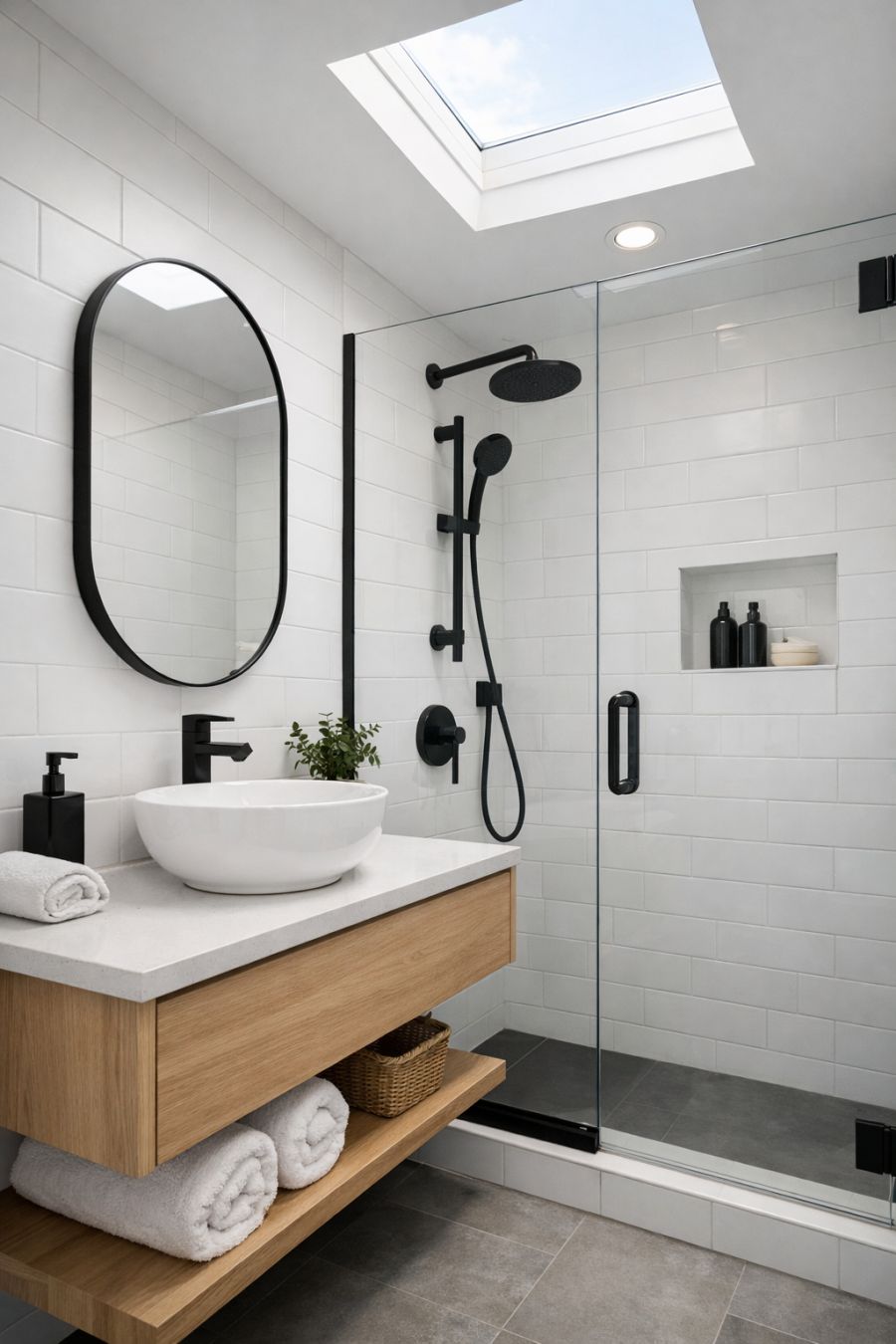 The bathroom is a showcase of modern minimalism, where form meets function in a harmonious blend. Crisp white tiles line the walls, contrasting with the matte black fixtures that provide a bold and stylish accent. The floating vanity, topped with a vessel sink, maximizes floor space while maintaining an airy feel. A walk-in shower, enclosed in clear glass, adds to the sense of openness, and a strategically placed skylight floods the room with natural light, enhancing its fresh and clean aesthetic.