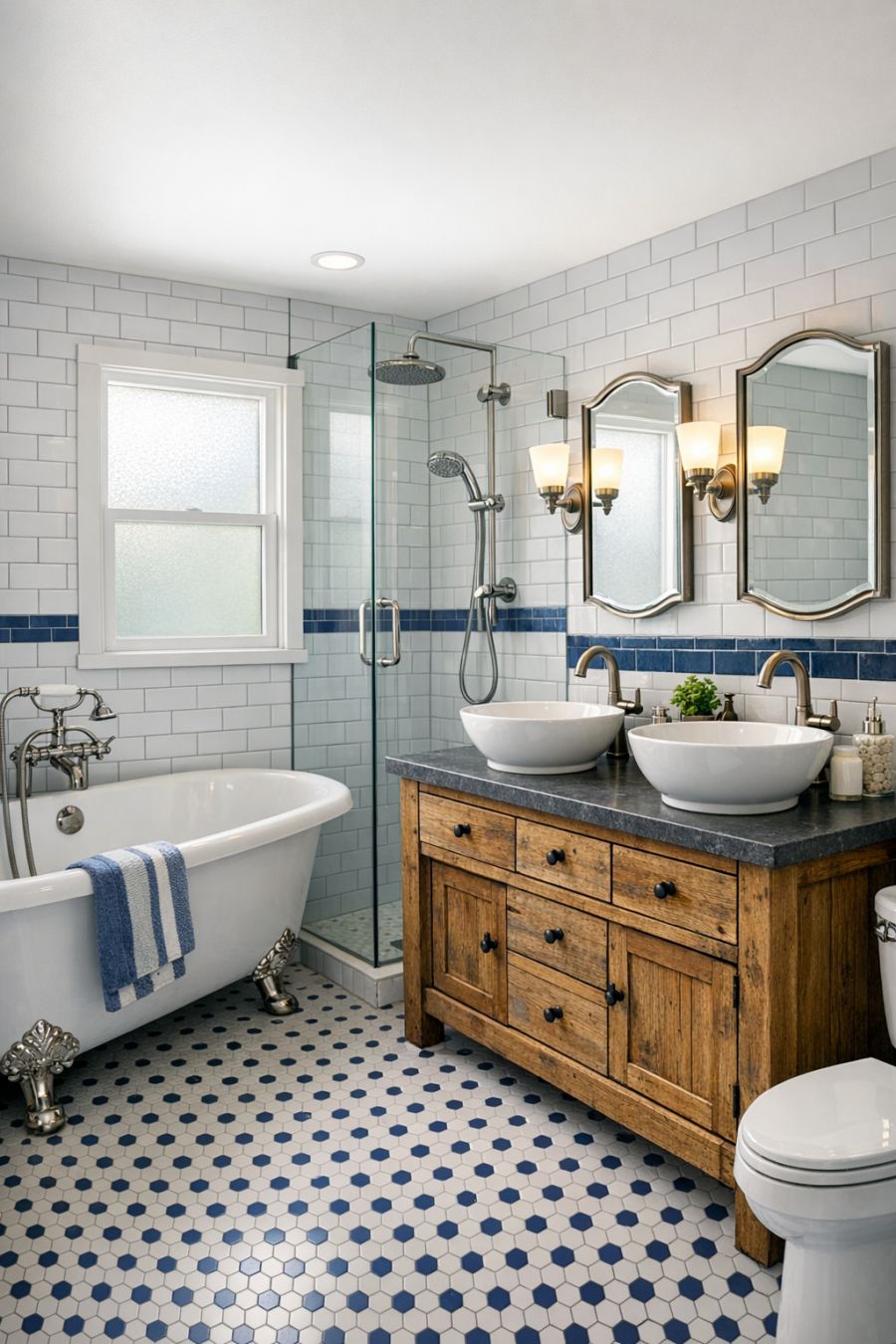 The bathroom combines elegance and functionality, offering a refreshing space to start and end your day. The room features a classic white and blue color scheme, with subway tiles lining the walls and a hexagonal tile floor adding visual interest. A vintage-style clawfoot tub invites relaxation, while a modern glass-enclosed shower provides practicality. The vanity is crafted from reclaimed wood, topped with a sleek stone countertop and a pair of stylish vessel sinks. Ample natural light streams in through a frosted window, ensuring privacy while keeping the space bright and welcoming.