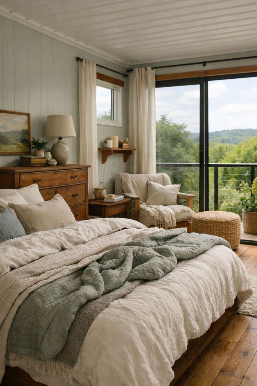 The bedroom is a serene retreat, designed with relaxation and comfort in mind. The walls are painted in a soft, calming hue that complements the natural wood tones of the floor and furniture. A cozy, oversized bed is dressed in layers of soft linens and quilts, inviting restful slumber. Large windows provide views of the surrounding landscape, bringing a sense of tranquility to the space. The room is thoughtfully decorated with minimal yet meaningful accents, including a vintage dresser and a small reading nook, creating a personal and peaceful sanctuary.