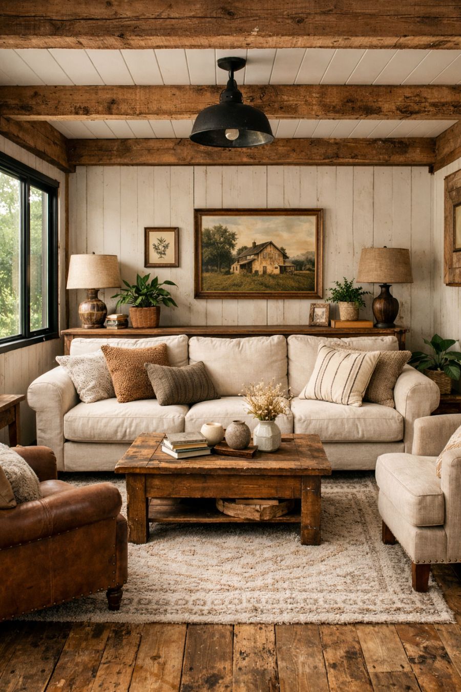 Upon entering the home, you are greeted by a spacious and welcoming living area. The interior design embraces a rustic farmhouse aesthetic, with reclaimed wood floors and exposed beams that add character and warmth. Large windows flood the room with natural light, creating an airy and open atmosphere. The decor features a mix of vintage and modern elements, with a comfortable, oversized couch and a pair of armchairs in neutral tones. A cozy rug anchors the space, while plants and carefully chosen artwork add personal touches that make the room feel like home.