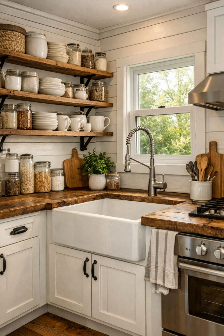 The kitchen is a harmonious blend of rustic charm and modern convenience. White cabinetry with classic farmhouse hardware provides ample storage, while open shelving displays a collection of ceramic dishware and glass jars filled with pantry staples. The countertops are crafted from reclaimed wood, adding warmth and texture to the space. A large farmhouse sink is both practical and stylish, complemented by a modern, stainless steel faucet. Natural light pours in through a window above the sink, creating a cheerful and inviting atmosphere perfect for culinary exploration.