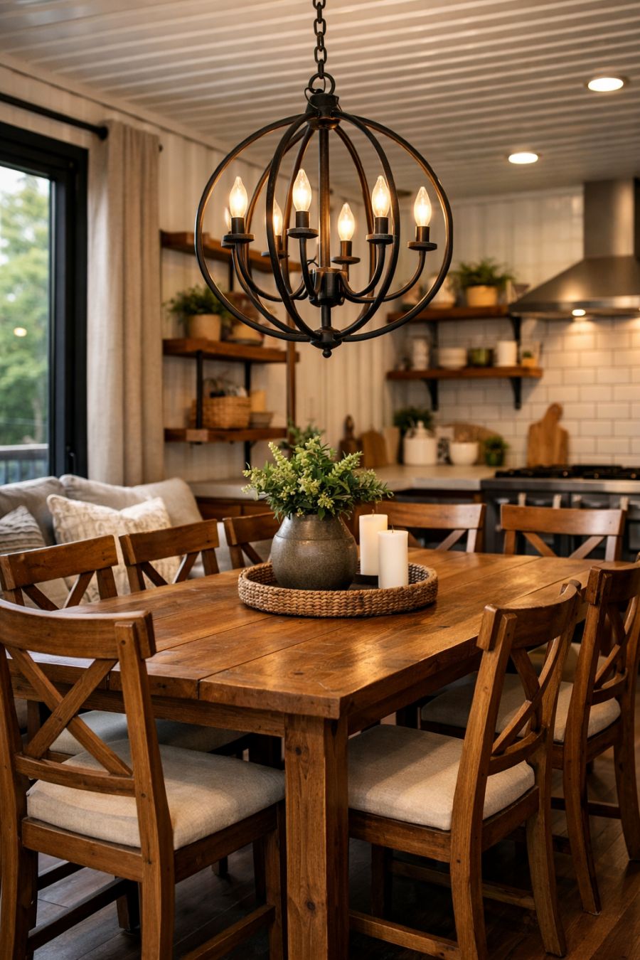 The dining area is a harmonious blend of functionality and style. A sturdy wooden dining table takes center stage, surrounded by matching chairs that offer ample seating for family and friends. Above, a statement chandelier casts a warm glow, creating an intimate setting for meals. The open layout allows for easy flow between the dining and living areas, promoting a sense of togetherness and space.