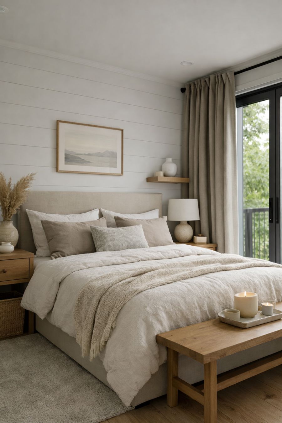 The bedroom is designed as a sanctuary of rest and relaxation. Soft, muted tones create a calming atmosphere, complemented by plush bedding that promises comfort. Large windows allow natural light to flood the space, while heavy drapes offer privacy and darkness when desired. Minimalist furniture ensures the room remains spacious, with a focus on serenity and simplicity.
