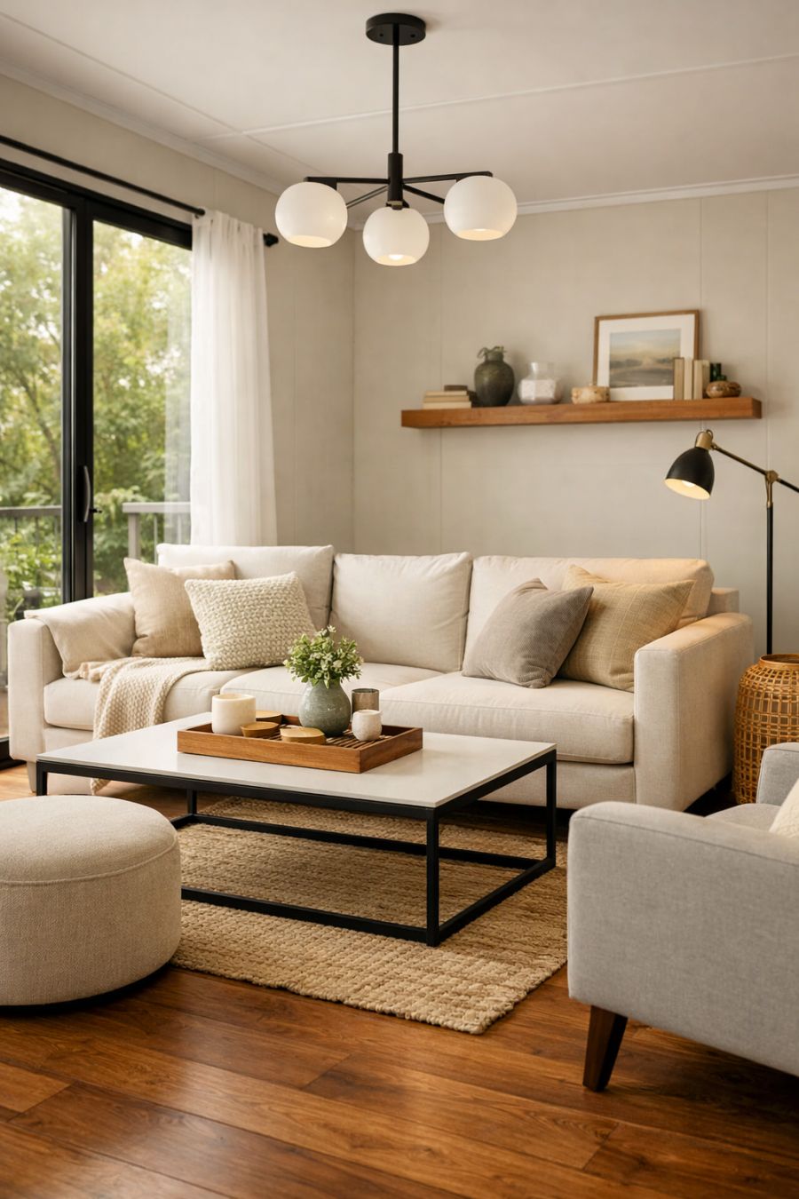 Step inside to a living area that is both cozy and elegant. The interior features light, neutral walls that enhance the natural light streaming in from large windows. Comfortable seating in the form of plush sofas invites you to relax and unwind. Modern touches like a sleek coffee table and chic lighting fixtures add a touch of sophistication, while wooden floors maintain a warm and inviting atmosphere.