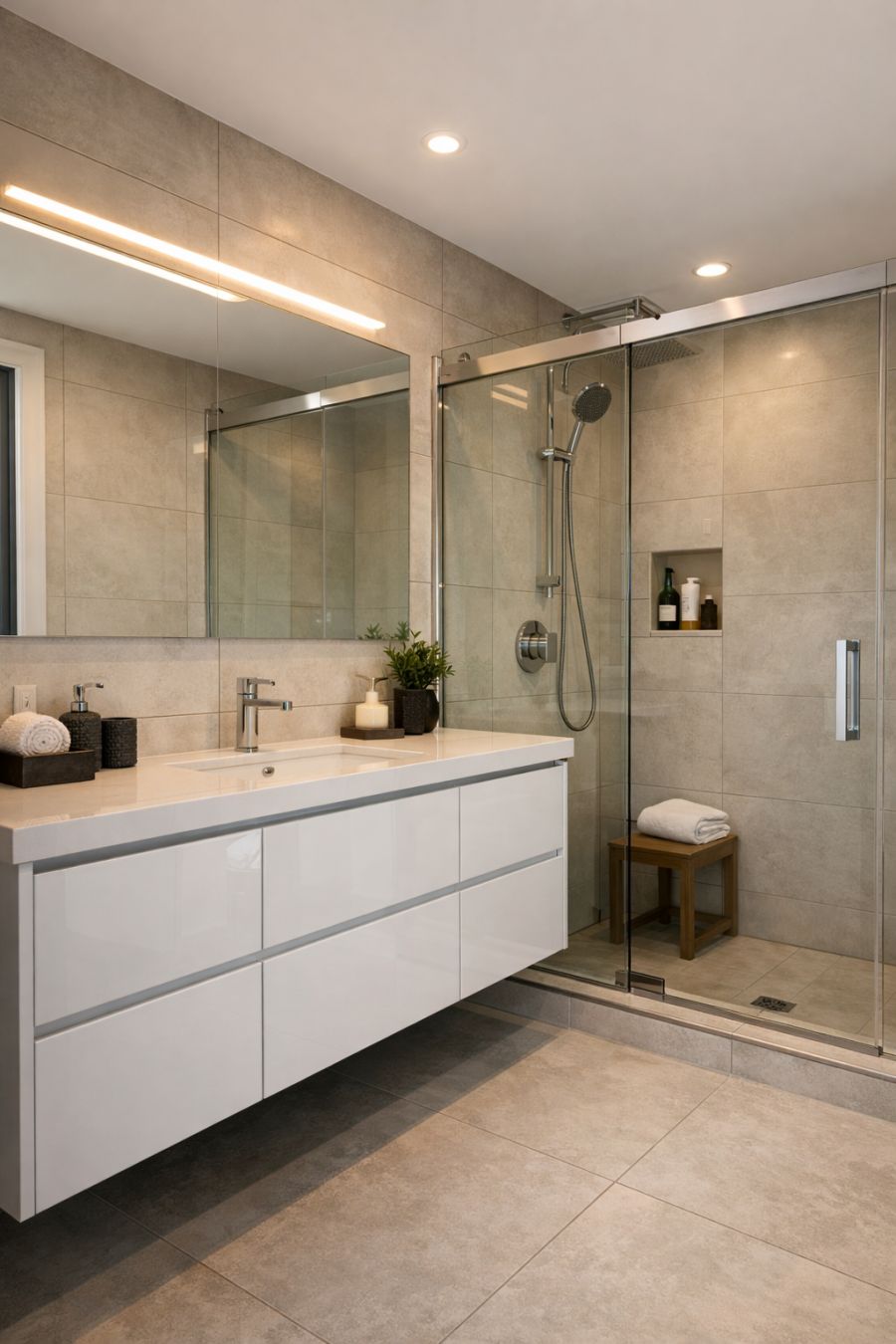 The bathroom is a study in modern elegance, featuring sleek fixtures and a neutral color palette. Large tiles line the floor and walls, creating a cohesive and clean look. The vanity, with its glossy surface and ample storage, is both functional and stylish. A spacious shower with a clear glass enclosure enhances the openness of the space, while soft lighting adds a touch of warmth.