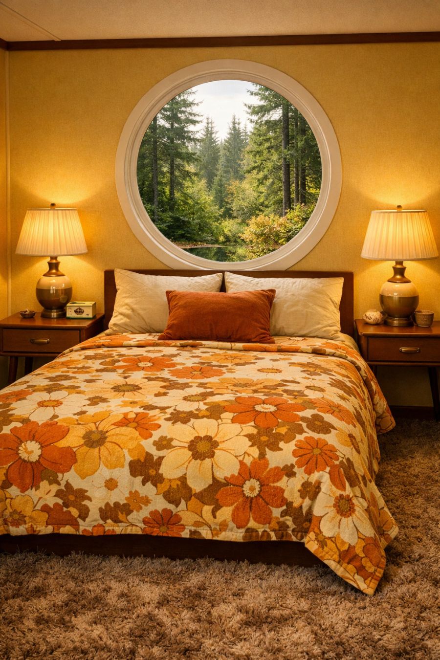 In the bedroom, the design takes a softer approach with serene colors that still whisper of the past. The walls are painted a gentle mustard yellow, complemented by a retro floral bedspread in warm tones. A shag rug in muted brown covers the floor, providing a cozy underfoot experience. Mid-century modern bedside tables flank the bed, each topped with a vintage lamp that casts a soft, inviting light. The round window offers a picturesque view of the forest, creating a peaceful retreat that feels both nostalgic and timeless.