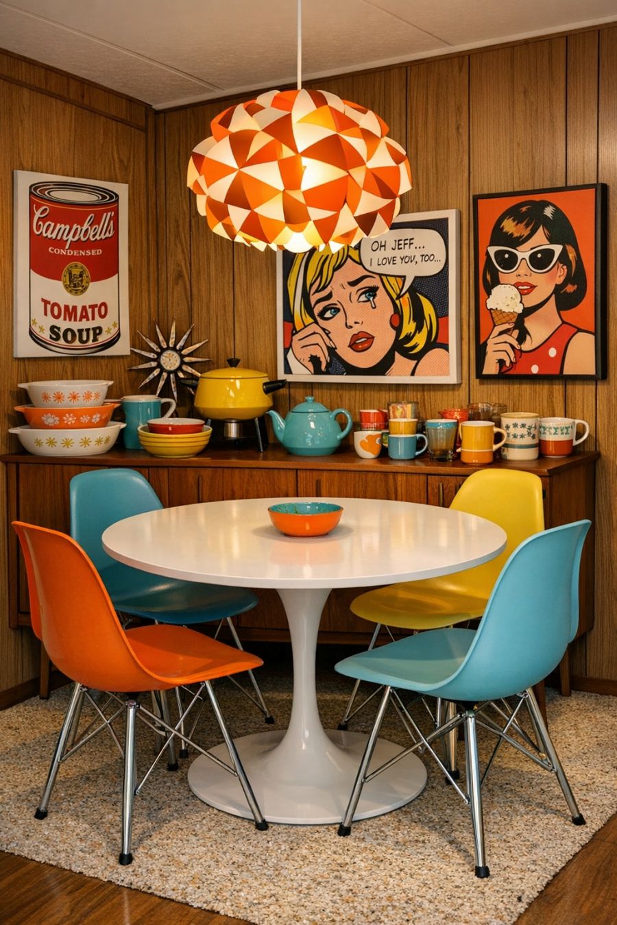 The dining area continues the retro theme with a round, tulip-style table surrounded by colorful Eames-inspired chairs. Against one wall, a vintage credenza holds a collection of eclectic dishware, each piece a nod to the playful design of the era. Above the table, a bold pendant light with an intricate geometric design casts a warm glow, creating a cozy atmosphere for meals. The walls are adorned with pop art prints that add a burst of color and character, making this the perfect spot for lively dinners and nostalgic gatherings.
