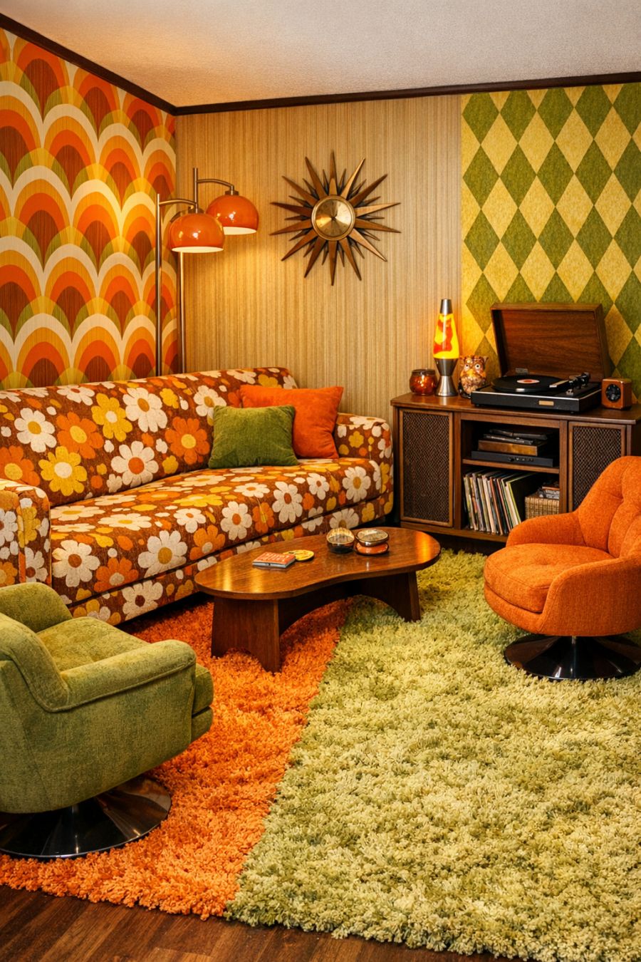 Upon stepping inside, the living area transports you straight into a 1970s dreamscape. The walls are adorned with bold, geometric patterns in vibrant oranges, yellows, and greens that evoke a sense of nostalgia. Plush shag rugs in funky colors cover the floor, inviting you to kick off your shoes and sink into their softness. A retro, low-slung sofa with a bold floral pattern anchors the room, surrounded by vintage armchairs and a record player in the corner that promises evenings filled with the warm crackle of vinyl.