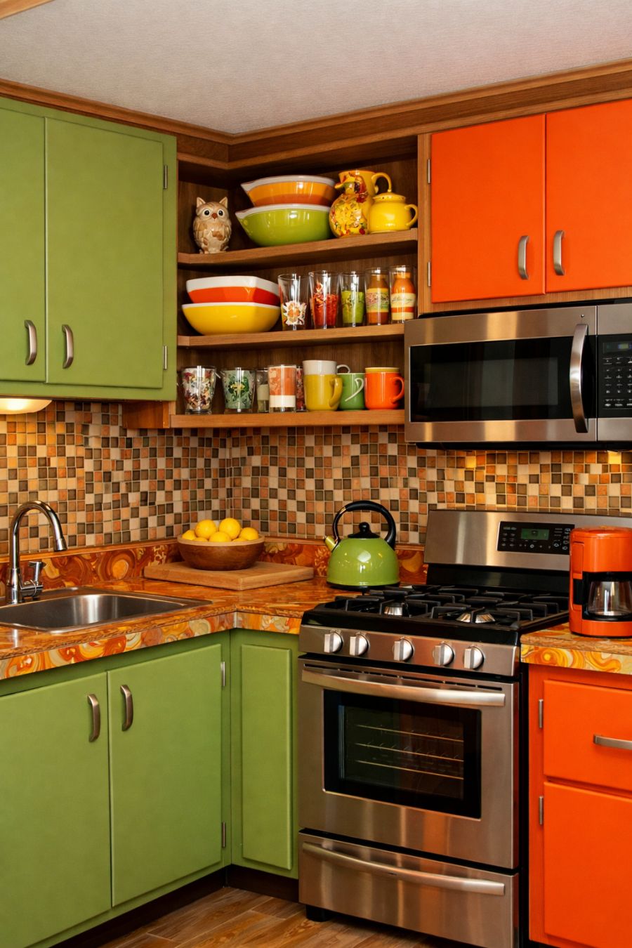 The kitchen is a delightful blend of retro charm and modern functionality. Brightly colored cabinets in orange and avocado green provide ample storage while maintaining the 70s vibe. The countertops are a striking laminate with a bold pattern reminiscent of the era, paired with modern appliances that make cooking a breeze. A set of open shelves displays a collection of vintage glassware and pottery, adding personality and color to the space. The backsplash features a mosaic of small tiles in earthy tones, tying the design together with a touch of rustic elegance.