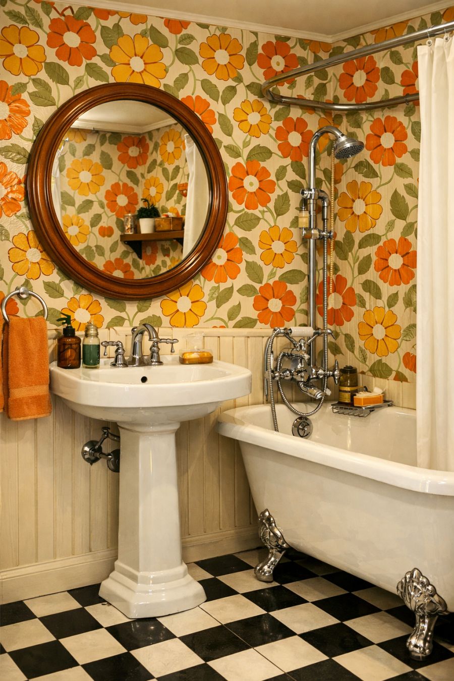 The bathroom continues the retro theme with a unique blend of style and functionality. The walls are covered in a vibrant floral wallpaper, reminiscent of the bold patterns of the 1970s. A pedestal sink with chrome fittings stands against the wall, paired with a clawfoot tub that invites relaxation. The floor is tiled in a checkerboard pattern, adding a playful touch to the space. A large round mirror hangs above the sink, framed in polished wood that complements the overall aesthetic, creating a space that feels both whimsical and inviting.