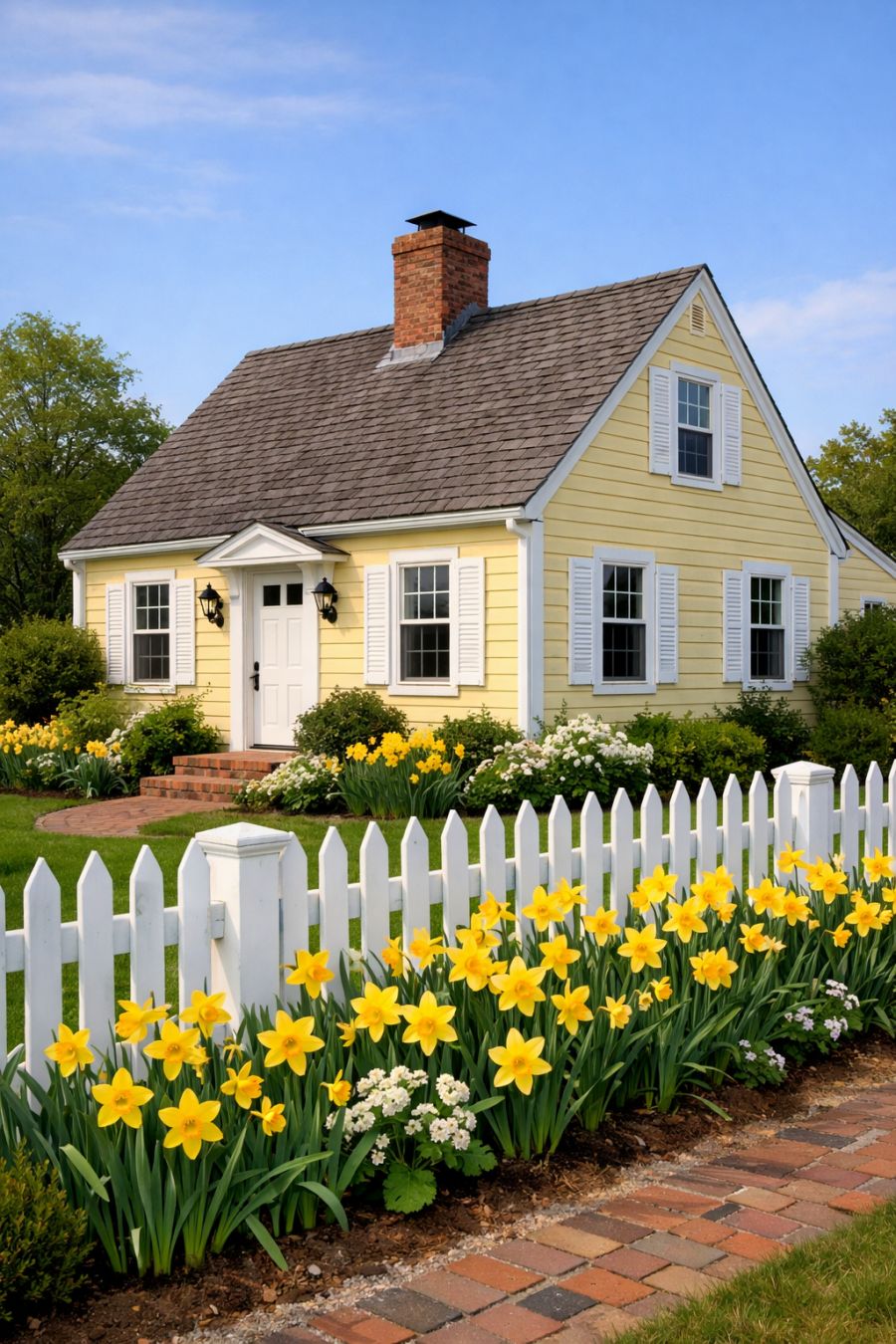 The exterior of this Cape Cod cottage is a picture of charming simplicity. The pale yellow clapboard siding exudes warmth and cheerfulness, while white shuttered windows add a touch of classic elegance. A steep gable roof with a central chimney hints at the cozy fireplace within, and a white picket fence lines the property, creating a quintessentially American scene. The garden bed, full of blooming yellow daffodils, adds a splash of color and a promise of the beauty that lies beyond the front door.