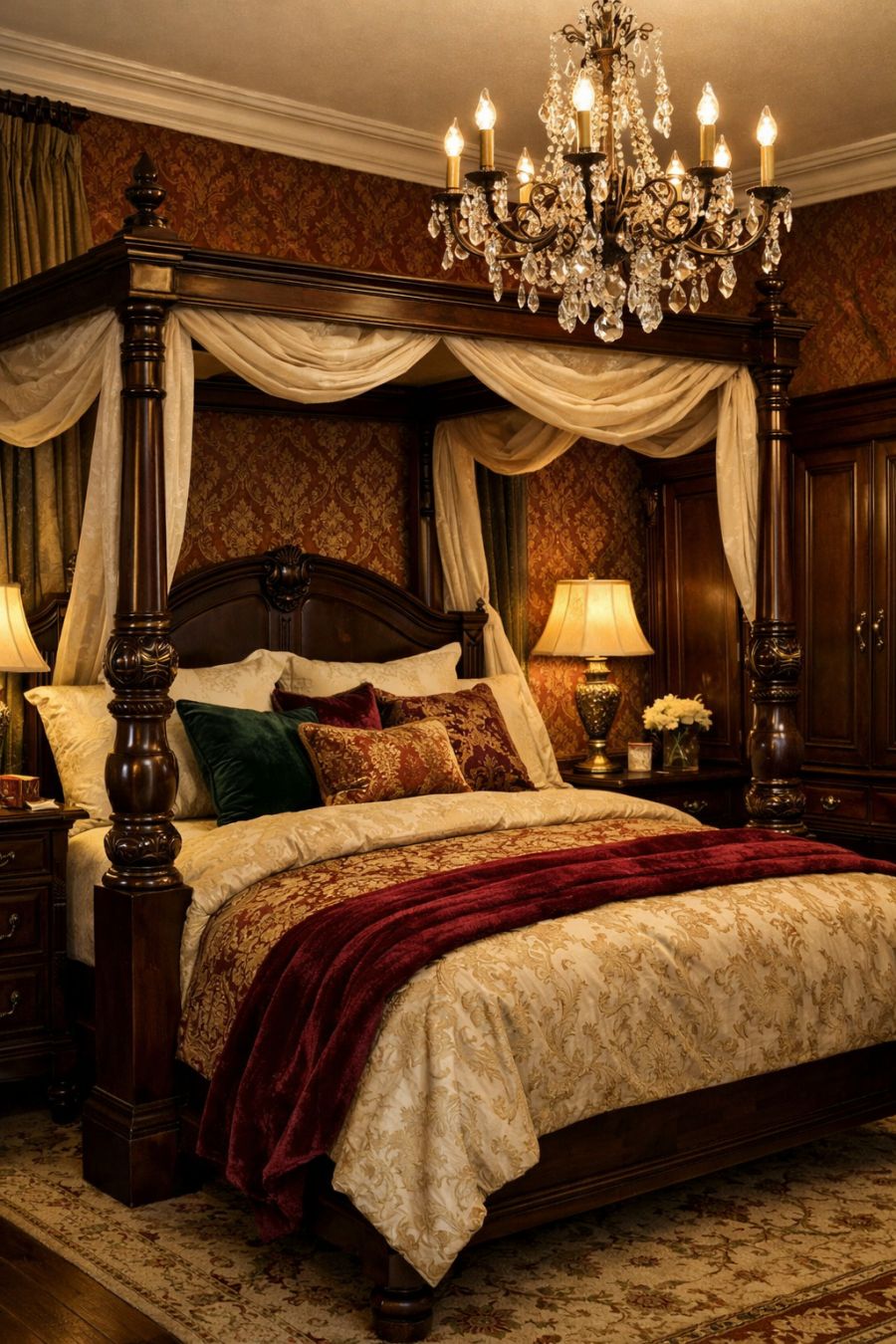 The bedroom offers a sanctuary of comfort and luxury, with a four-poster bed draped in sumptuous fabrics and accented by plush pillows. The dark wood of the bed frame is echoed in the matching nightstands and armoire, providing ample storage and a sense of continuity. Rich, jewel-toned wallpaper envelops the room in warmth, while a crystal chandelier provides both illumination and a touch of glamour. Heavy drapery ensures privacy and a restful night's sleep, completing the room's opulent yet cozy feel.