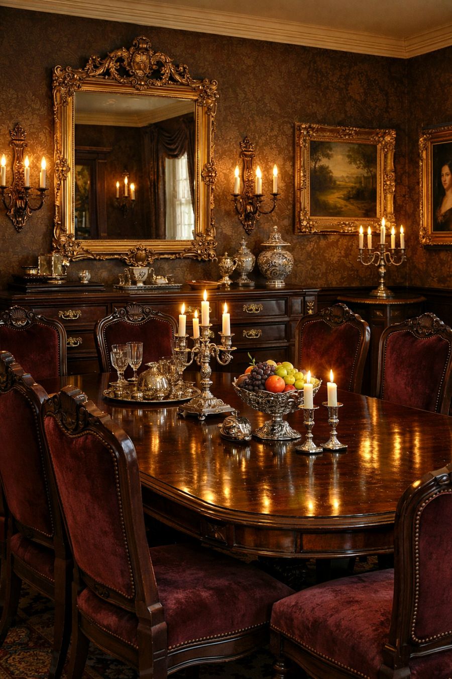 The dining area continues the theme of Victorian grandeur, with a large mahogany dining table taking center stage. Surrounding it are high-backed velvet chairs, inviting guests to sit and savor both meals and conversation. The walls are adorned with gilded mirrors and period art pieces, reflecting the warm glow of candelabra-style wall sconces. A sideboard, crafted from dark wood and adorned with brass handles, provides both functionality and a touch of sophistication.