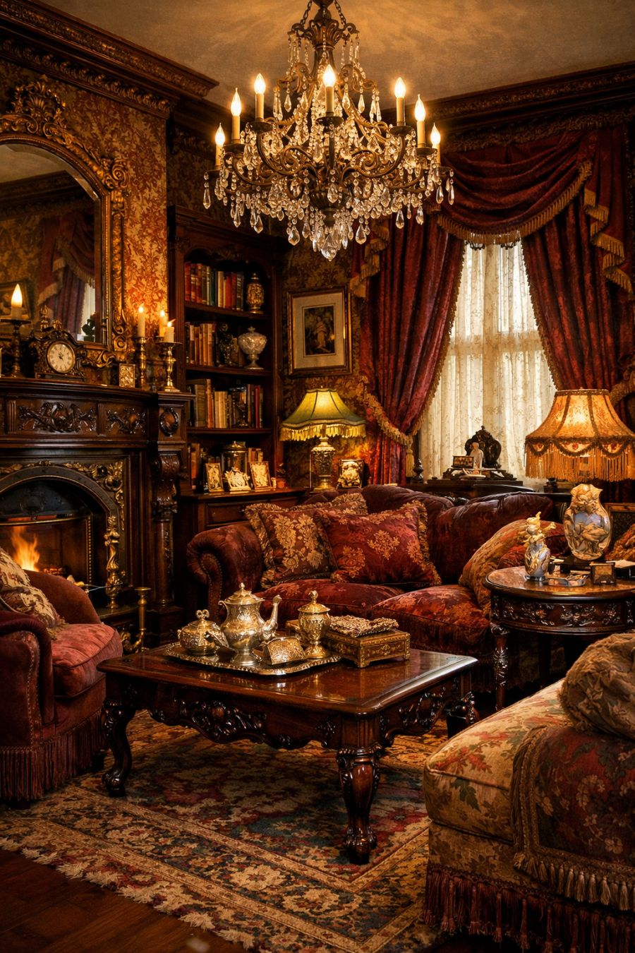 As you step inside, the living area reveals a Victorian maximalist interior that is both opulent and inviting. Rich velvet drapes adorn the windows, casting a warm glow across the room. Dark wood furnishings, intricately carved and polished to a sheen, offer a sense of timeless elegance. An ornate chandelier hangs from the ceiling, illuminating the space with a soft, ambient light that highlights the intricate patterns of the wallpaper and the rich textures of the upholstery.