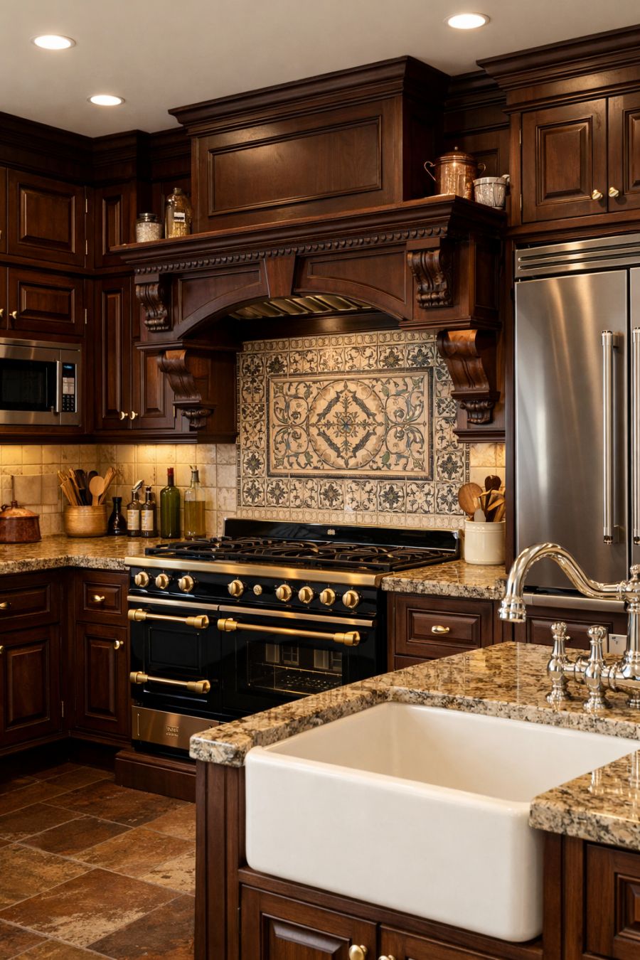 In the kitchen, the Victorian inspiration takes on a modern twist with state-of-the-art appliances seamlessly integrated into the rich, dark wood cabinetry. Granite countertops provide ample space for culinary creations, while a large farmhouse sink adds a nod to the home's Cape Cod roots. A vintage-inspired range cooker stands as a centerpiece, its brass accents complementing the intricate tile backsplash. The kitchen is both a functional workspace and a continuation of the home's elegant aesthetic.