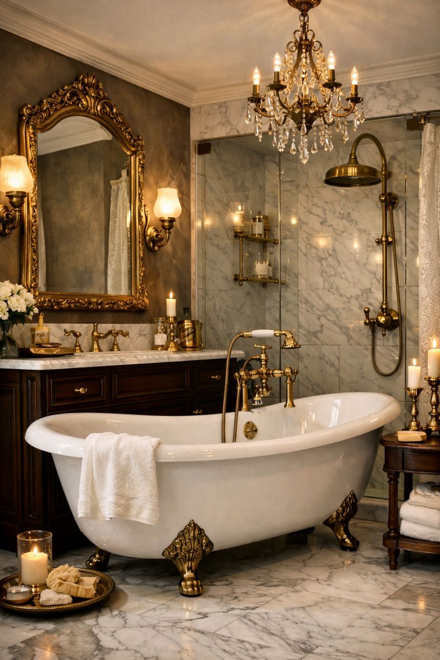 The bathroom is a harmonious blend of functionality and Victorian elegance, featuring a freestanding clawfoot tub as its centerpiece. Marble floors and countertops offer a luxurious touch, while dark wood cabinetry provides a rich contrast. Brass fixtures, including a rain shower head and vintage-style taps, add a classic elegance to the space. Soft lighting and a large, ornate mirror complete the atmosphere, creating a serene retreat for relaxation and rejuvenation.