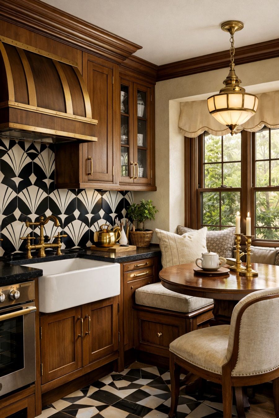 The kitchen is a blend of modern convenience and vintage charm, with sleek appliances subtly integrated into the Art Deco design. Black and white geometric tiles form a striking backsplash, contrasting beautifully with the warm wood tones of the cabinetry. Brass fixtures add a touch of luxury, while a large farmhouse sink pays homage to the cottage's rustic roots. A cozy breakfast nook, bathed in natural light, provides a perfect spot for morning coffee, surrounded by the elegance that defines the rest of the home.